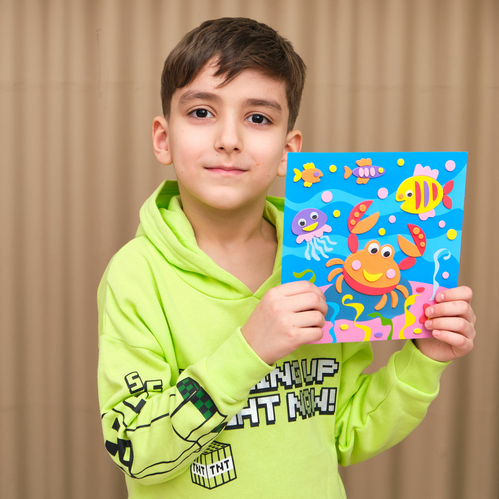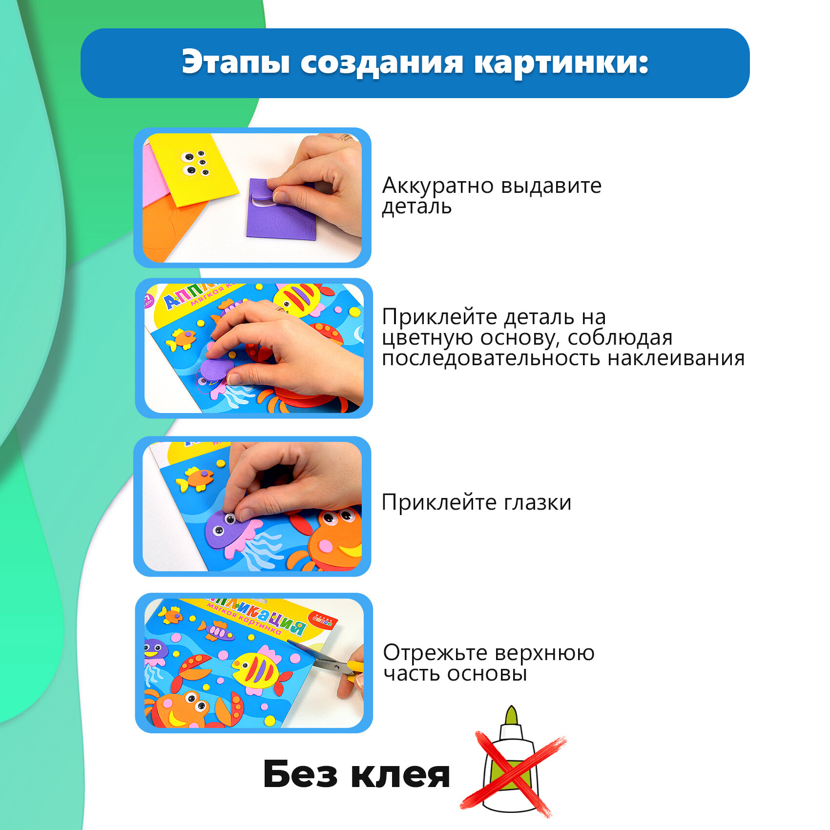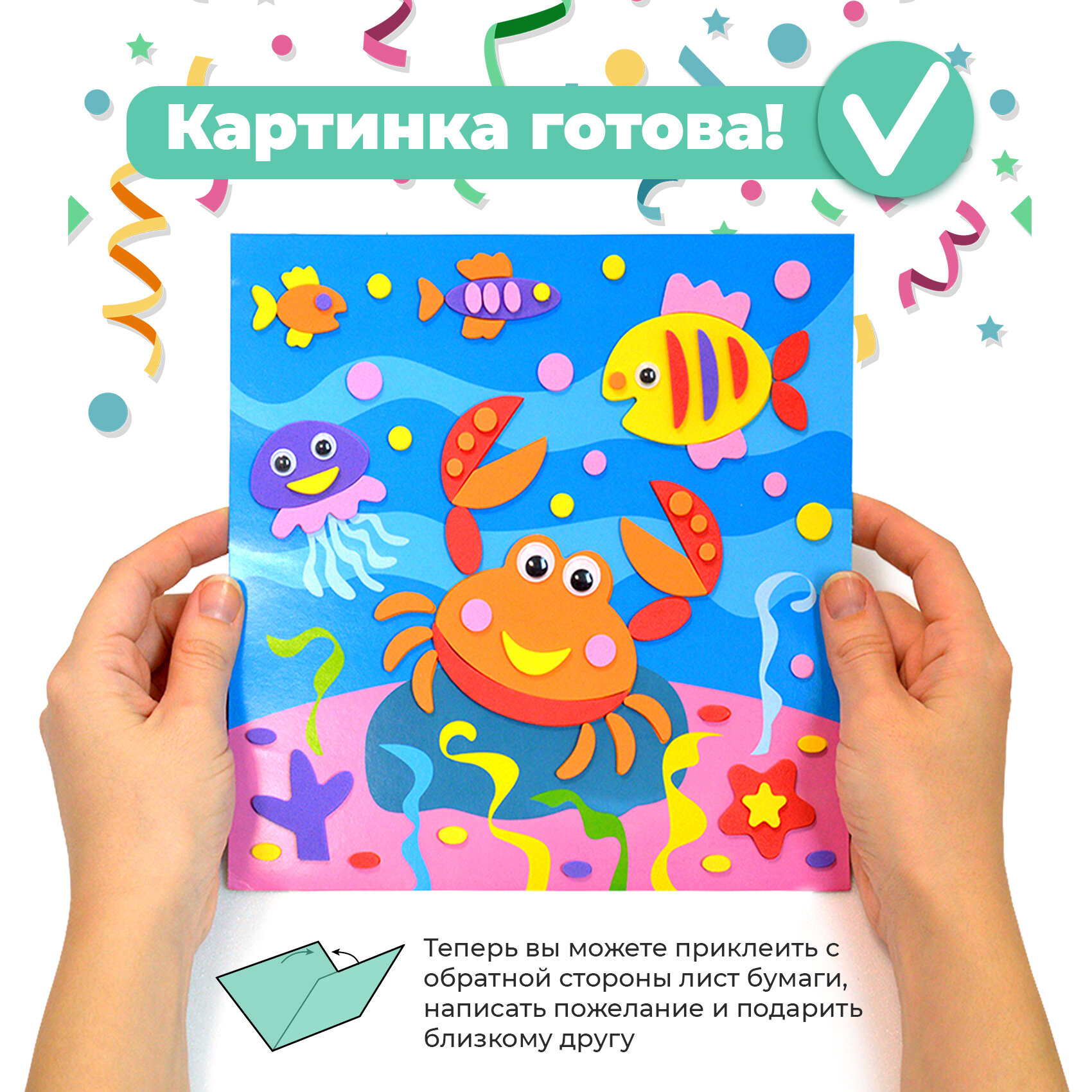 Для создания забавной мягкой картинки вам не понадобятся дополнительные материалы, клей или ножницы. Всё необходимое вы найдёте в нашем наборе. Чтобы наклеить деталь, нужно аккуратно снять её с защитной плёнки и приложить в нужное место на картинке.