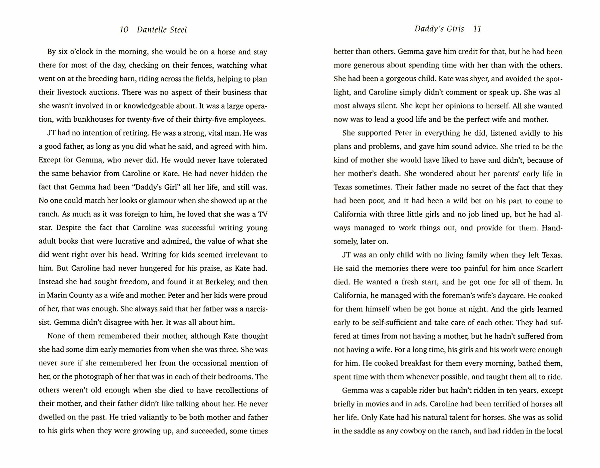 Caroline, the youngest, was overlooked by her father. She fled the ranch as early as she could to become a wife and mother, pursuing a career writing children's books. Gemma, his declared favourite, yearned for Hollywood glamour and became a major TV star. Kate, the eldest, stayed to work on the ranch, forsaking relationships and family for a father who took her for granted.