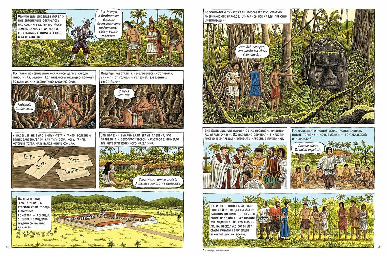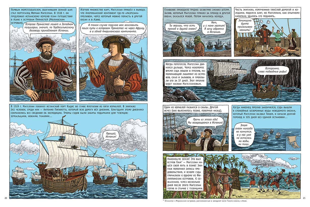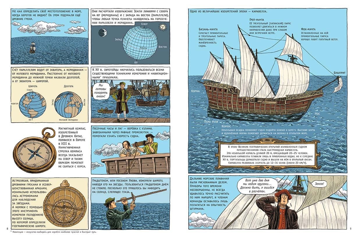Комикс посвящен Великим географическим открытиям, совершенным европейцами в XV–XVII веках. Автор – французская писательница Доминик Жоли – пишет познавательные книги по истории для детей и подростков. Российские читатели, возможно, знакомы с ней по энциклопедиям «Великие цивилизации» и «Средние века».