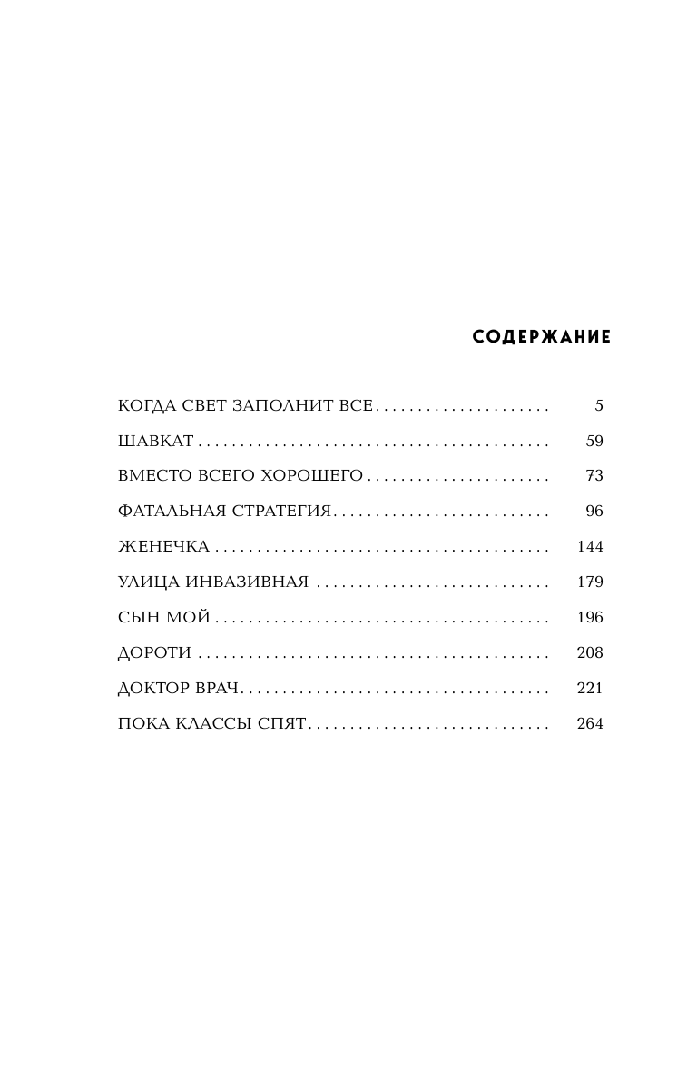 "Вместо всего хорошего" о сидящей на антидепрессантах девице. "Фатальная стратегия" квест, подтверждающий невозможность вновь войти в ту же реку. Набоковско-бунинская "Женечека", кошмар эколога "Улица Инвазивная", не беззлобный стеб на тему повесточки "Сын мой" и "Дороти", которая явно не в Канзасе, отрезанная заботливым оберегающим ее отцом от всех проявлений реальной жизни, зарабатывает малую копеечку на содержание себя и папы на онлайн бирже из-за монитора в хрущовке. Хоррор "Доктор Врач" и дурацкий, но забавный "Пока классы спят" о привнесении идеологической борьбы в нестройные ряды пользователей порносайтов.