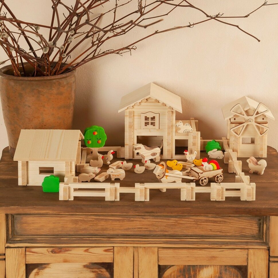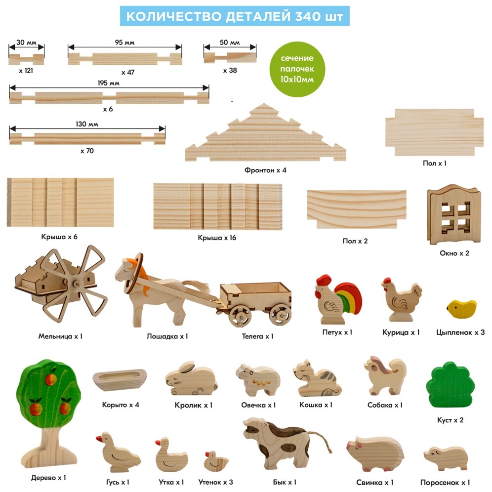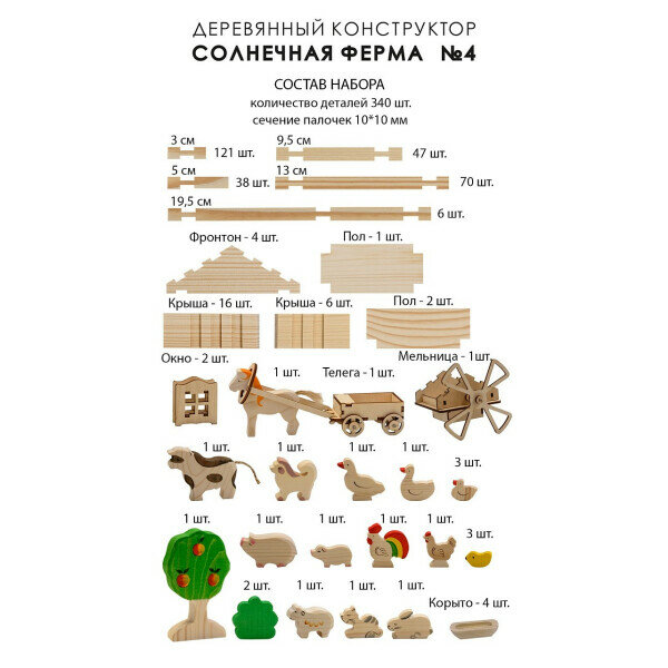 Количество деталей: 340 шт. (11 видов деталей, 18 фигурок животных и доп.аксессуары: мельница, телега, яблоня, куст - 2 шт., корыто - 4 шт.).