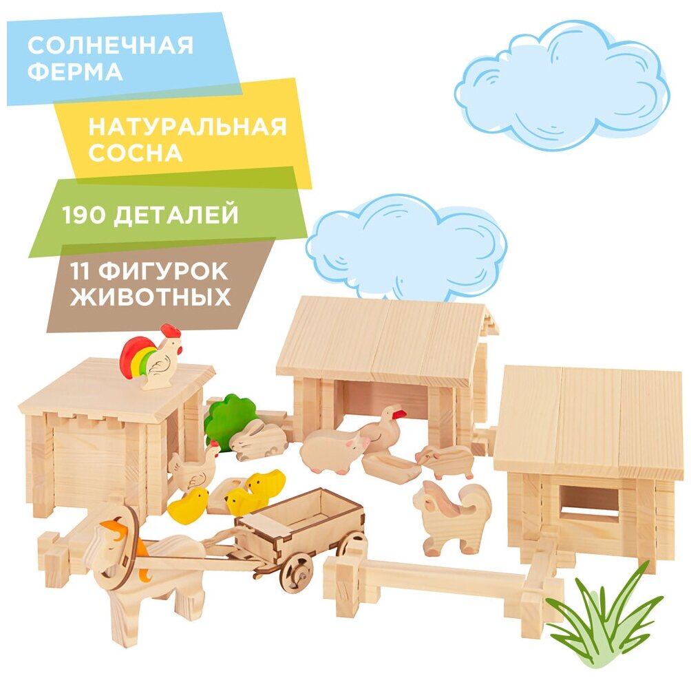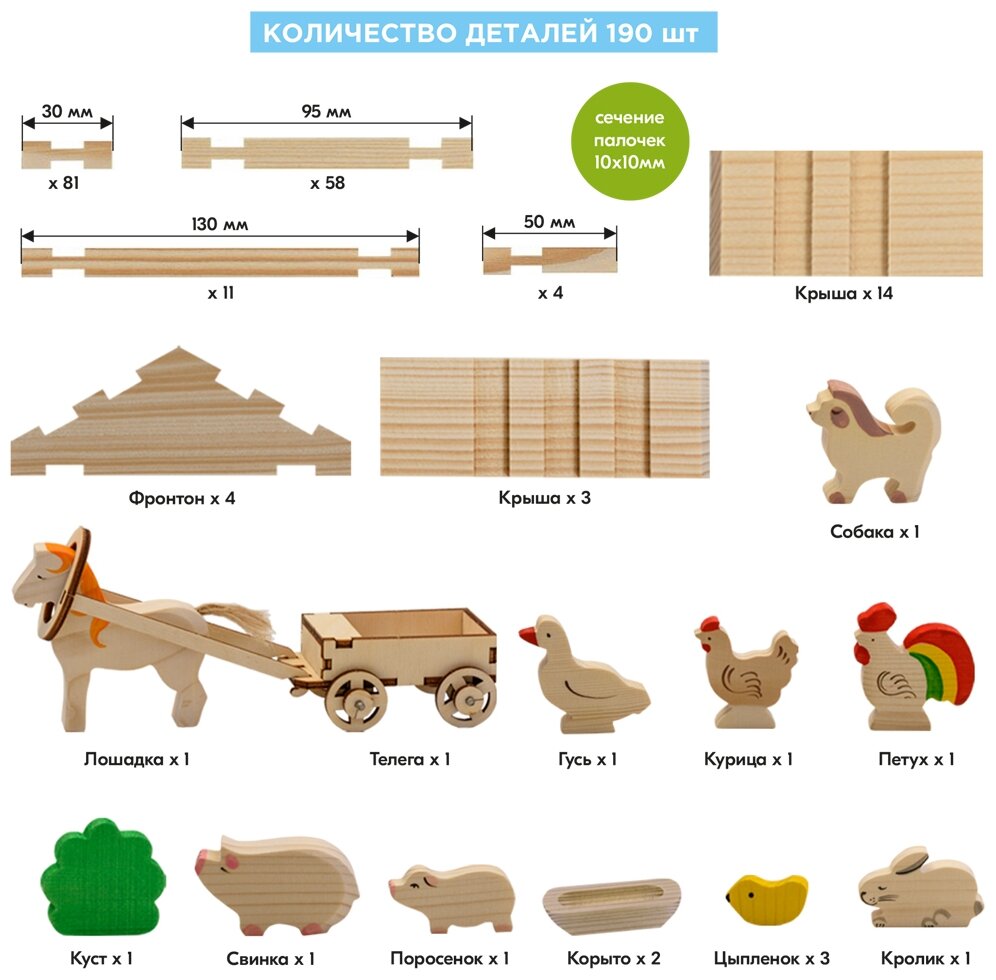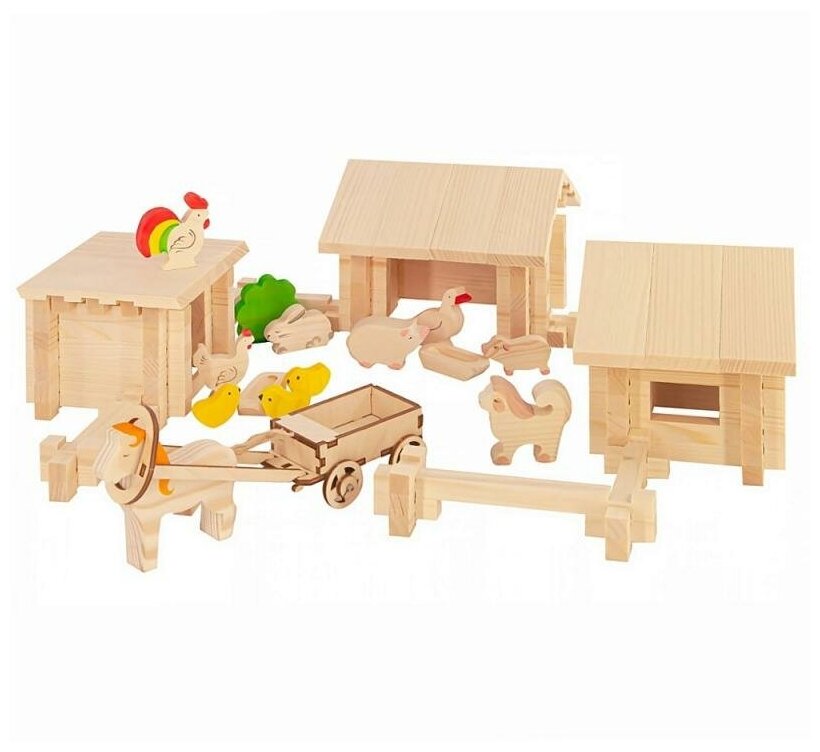 Из 190 деталей малышу предстоит собрать собственное фермерское хозяйство и построить для его обитателей уютный дворик с деревянными постройками. Конструктор включает в себя аккуратно выточенные брусочки разной длины, дополнительные строительные элементы, а также фигурки симпатичных жителей фермы: собачки, лошадки, свиньи с поросенком, гуся, кролика, петуха и курочки с цыплятами.