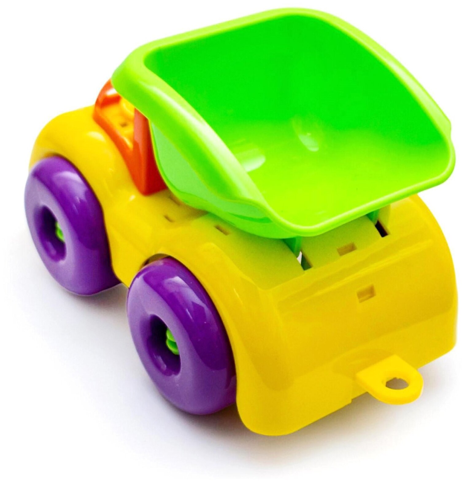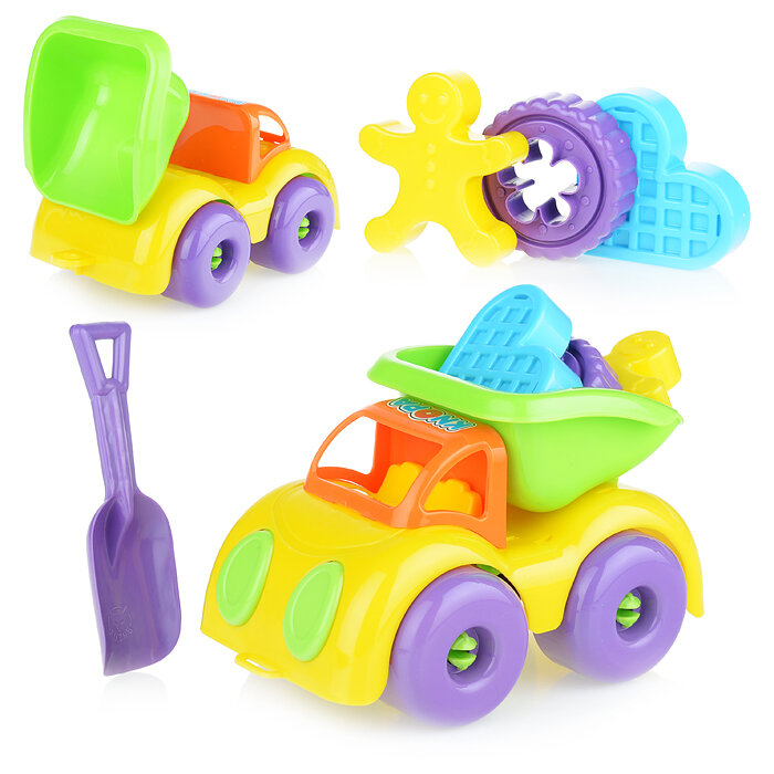 В составе песочного набора - машинка, три формочки и совочек.