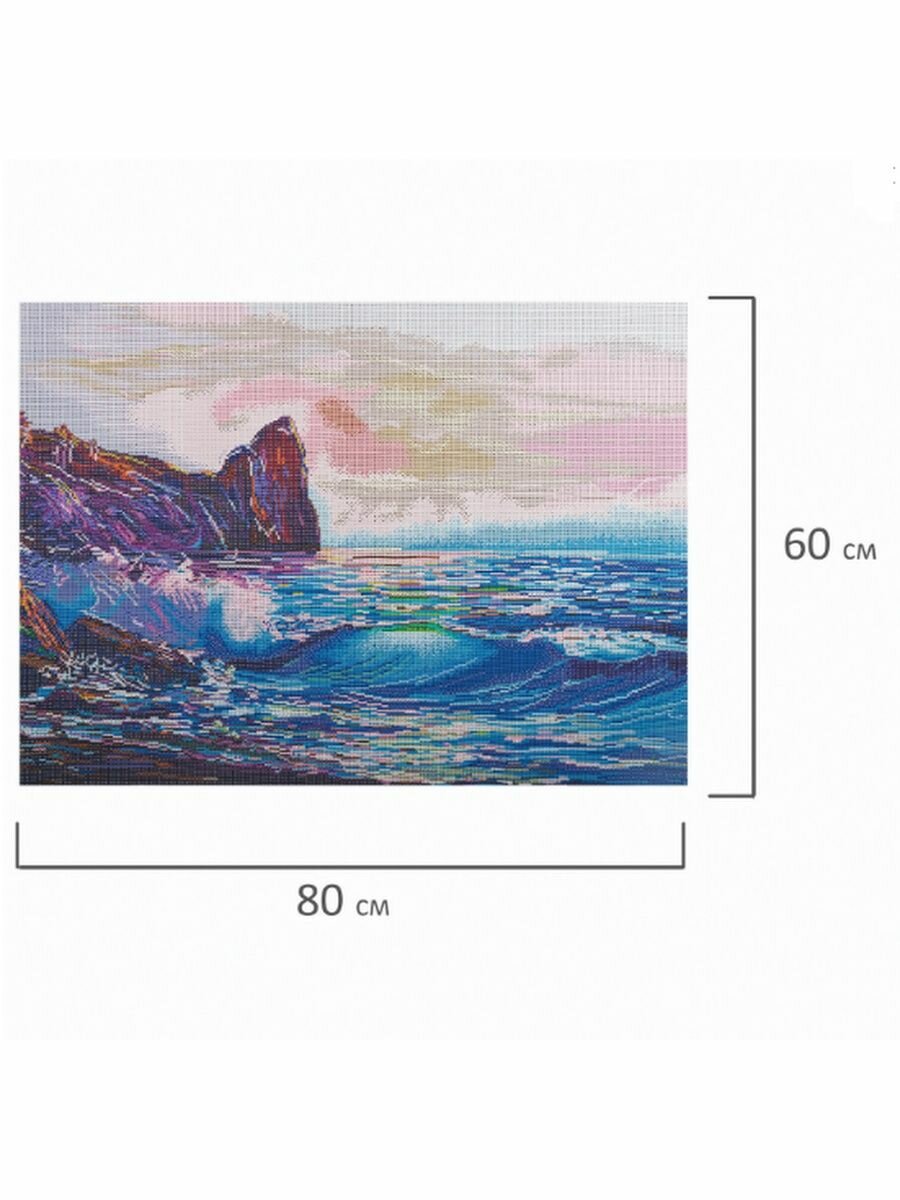Размер готовой картины составляет 60х80 см. Картина полностью заполняется квадратными акриловыми стразами, благодаря чему готовая работа блистает и переливается на свету.