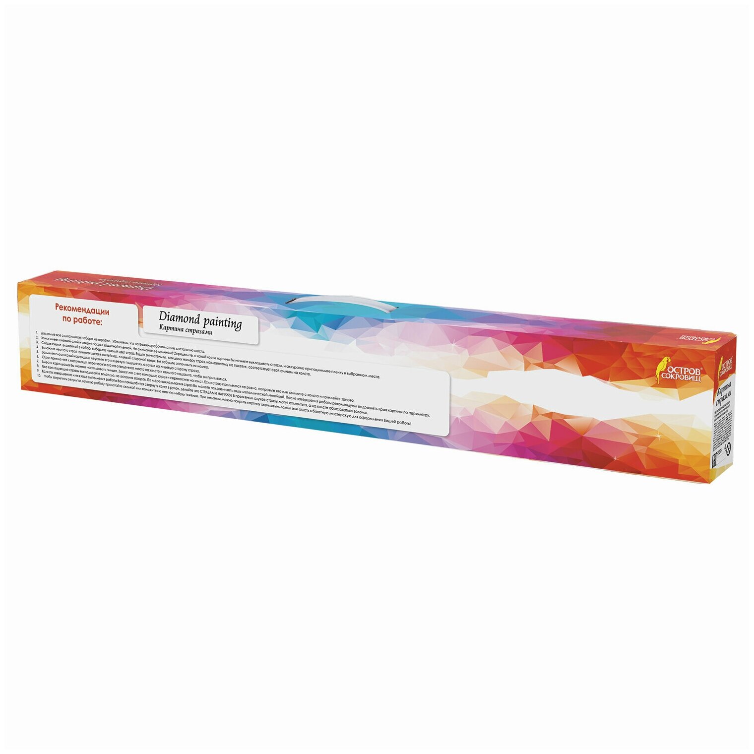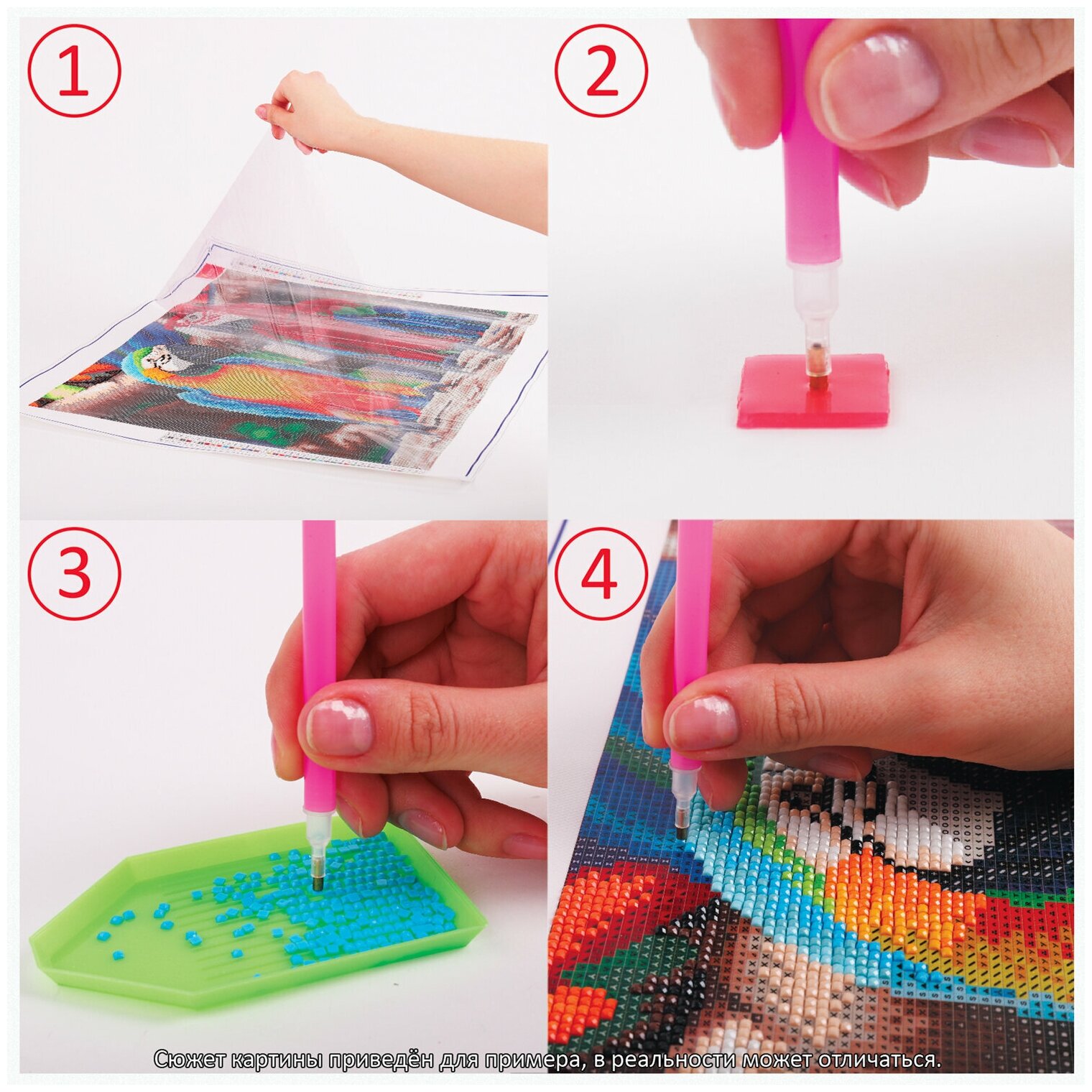 | Комплектация | - свёрнутый холст размером 66х86 см; - набор квадратных страз разных цветов, пронумерованных в соответствии со схемой; - набор удобных закрывающихся пакетиков; - металлический пинцет; - пластиковый карандаш-стилус для захвата страз; - клеевая подушечка; - пластиковый контейнер; - схема соответствия цветов страз и символов на холсте. |