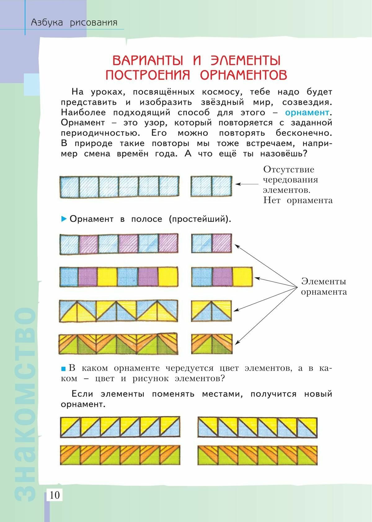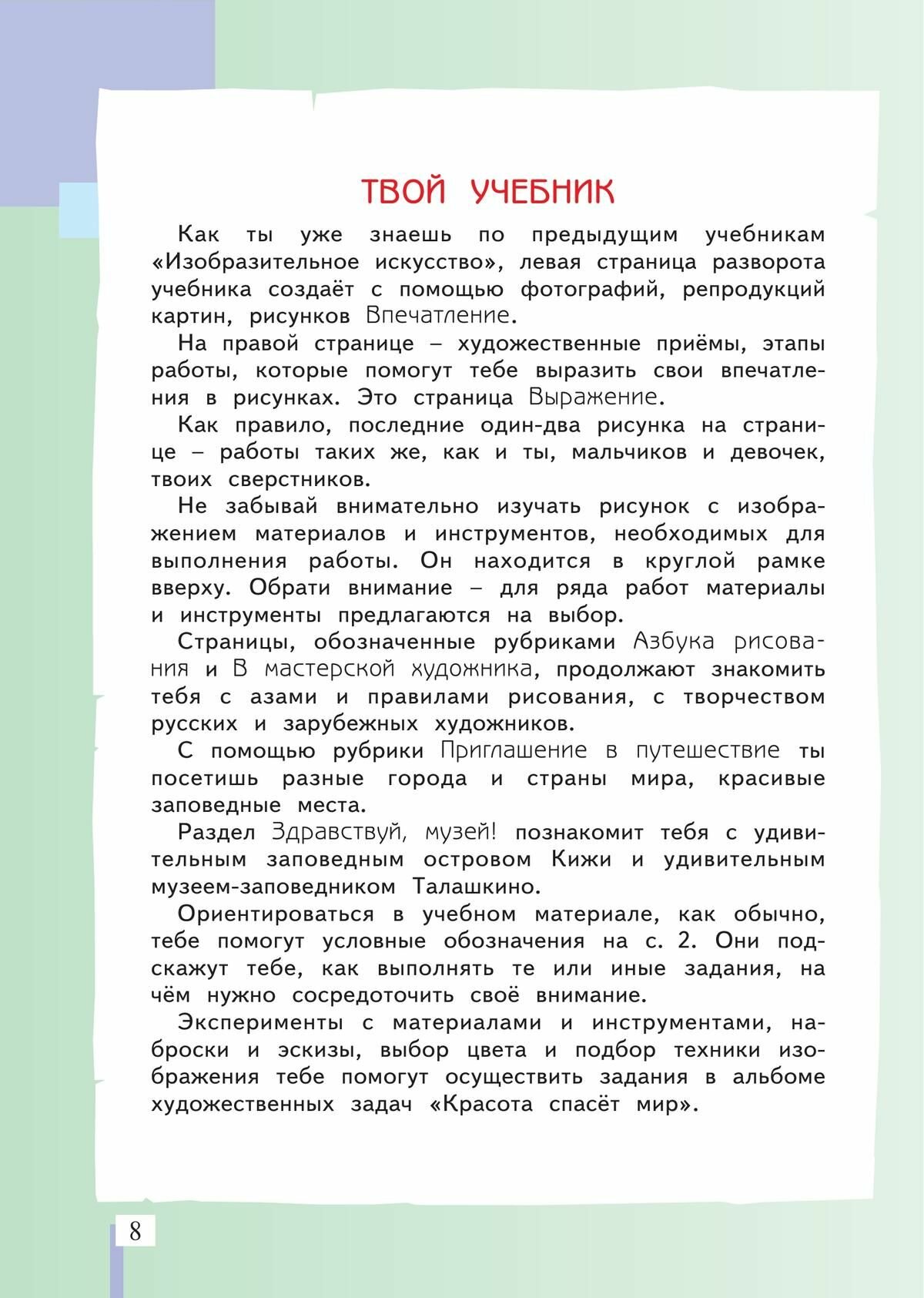 Содержание учебника направлено на развитие воображения, наблюдательности, творческого потенциала ребенка, формирование у него художественного взгляда на окружающий мир. Учащиеся знакомятся с начальными понятиями изобразительного искусства, творчеством лучших русских и зарубежных художников. Большое внимание в учебнике уделено приобретению школьниками первоначальных навыков работы в различных видах художественно-творческой деятельности, пробуждению интереса к рисованию.