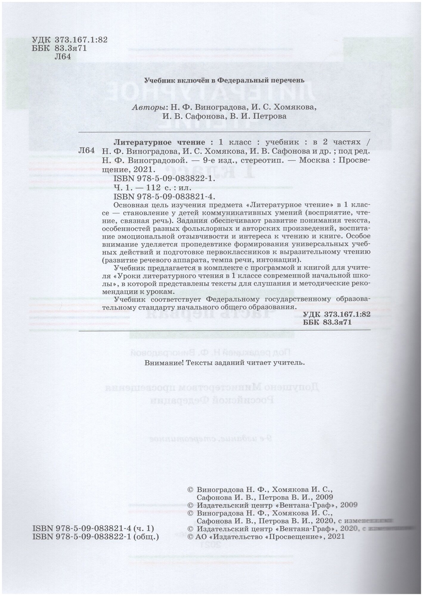 Литературное чтение 1 класс Учебник В двух частях Часть первая (Виноградова Наталья Федоровна, Хомякова Ирина Семеновна, Сафонова Ирина Владимировна); Вентана-Граф, 2021