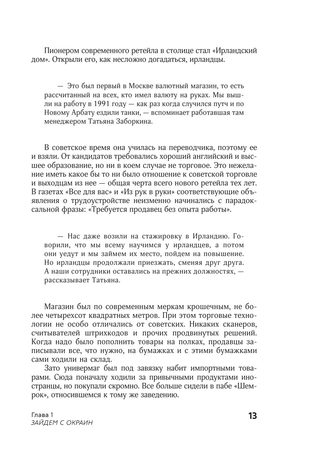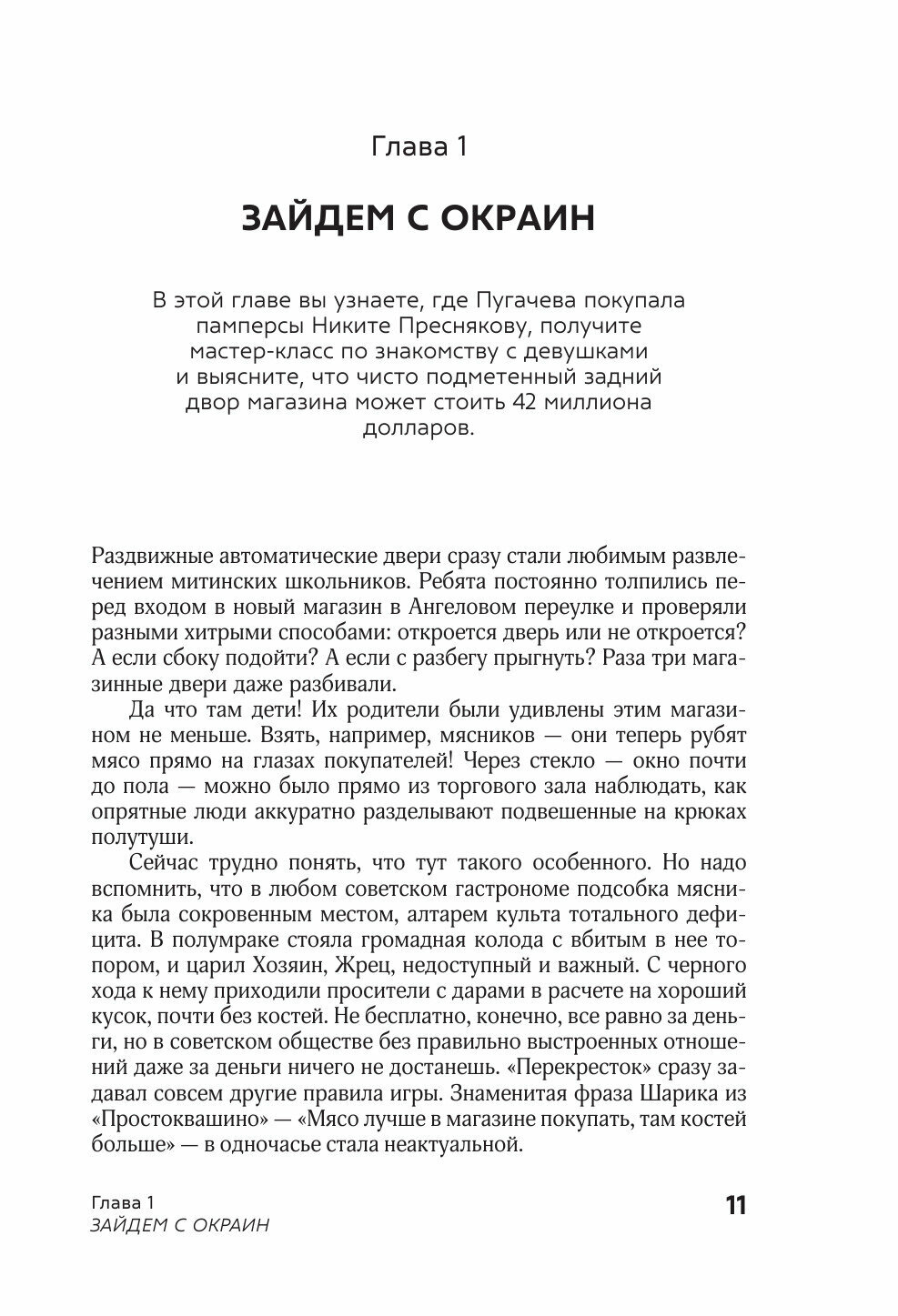 Получила эту книгу в печатном виде, поэтому пишу про печатный вариант. Она просто шикарная. Мне ее советовали, но я так не люблю читать про бизнес в свободное от работы время! И тема ритейла, ну, вообще неинтересна для меня, однако убедили, что она классная, поэтому открыла, начала читать и не смогла оторваться. Несколько вечеров подряд ложилась спать часа на два позже, потому что «ну, еще страничку и выключаю свет». Здесь и ностальгия и корпоративный экшн, и веселые 90-е, и миллион любопытных эпизодов и намечающихся тенденций. Вот, правда, интересно, всем. А первый руководитель Косьяненко – это мой герой теперь. Как он говорит про первые банковские кредиты, что решил с банками действовать, как с девушками: обойти всех, может кто-то и даст.:) Начало вообще должно войти в учебник перестроечного быта, потом про первый классный магазин и первый дискаунтер, когда «оптовка фактически переехала к дому» вместе с Пятерочкой, и безумная корпоративная культура первых Пятерочек с гимнами и орденами Гриффона. Потрясающий сюжет с бесконечной сменой руководителей. Когда вроде вот он пришел и там пошло, и там мобилизация, захват регионов, соперничество с «Магнитом», внезапные рейды, а кончается все равно: «в итоге даже лучше, что он ушел и на его место пришел…». А как автор пишет! Понравилось даже послесловие, которое не читаю обычно: «У меня дома сгнил килограмм лука и по кухне распространился запах, знакомый с детства, именно так пахло в овощных отделах магазина 90-х». Цитата по памяти, но это просто восторг и поэзия. Пока читаешь, задумываешься, неужели нам недавно было хорошо, когда дешево, сердито и без окон без дверей, с ящиками на полу, а сейчас уже просто купить мало, нужна многоразовая сумка, улыбка и кокосовый сахар вместо обычного? Свою Пятерочку и Перекресток у дома все равно не люблю, они пока явно проигрывают Вкусвиллу в моих глазах, но, может, еще просто не успели открыть в моем районе что-то такое инновационное из последней главы.