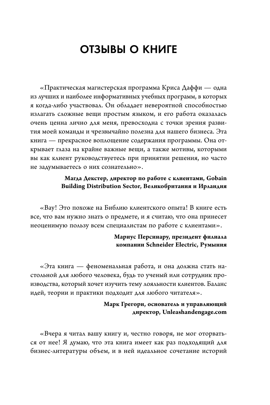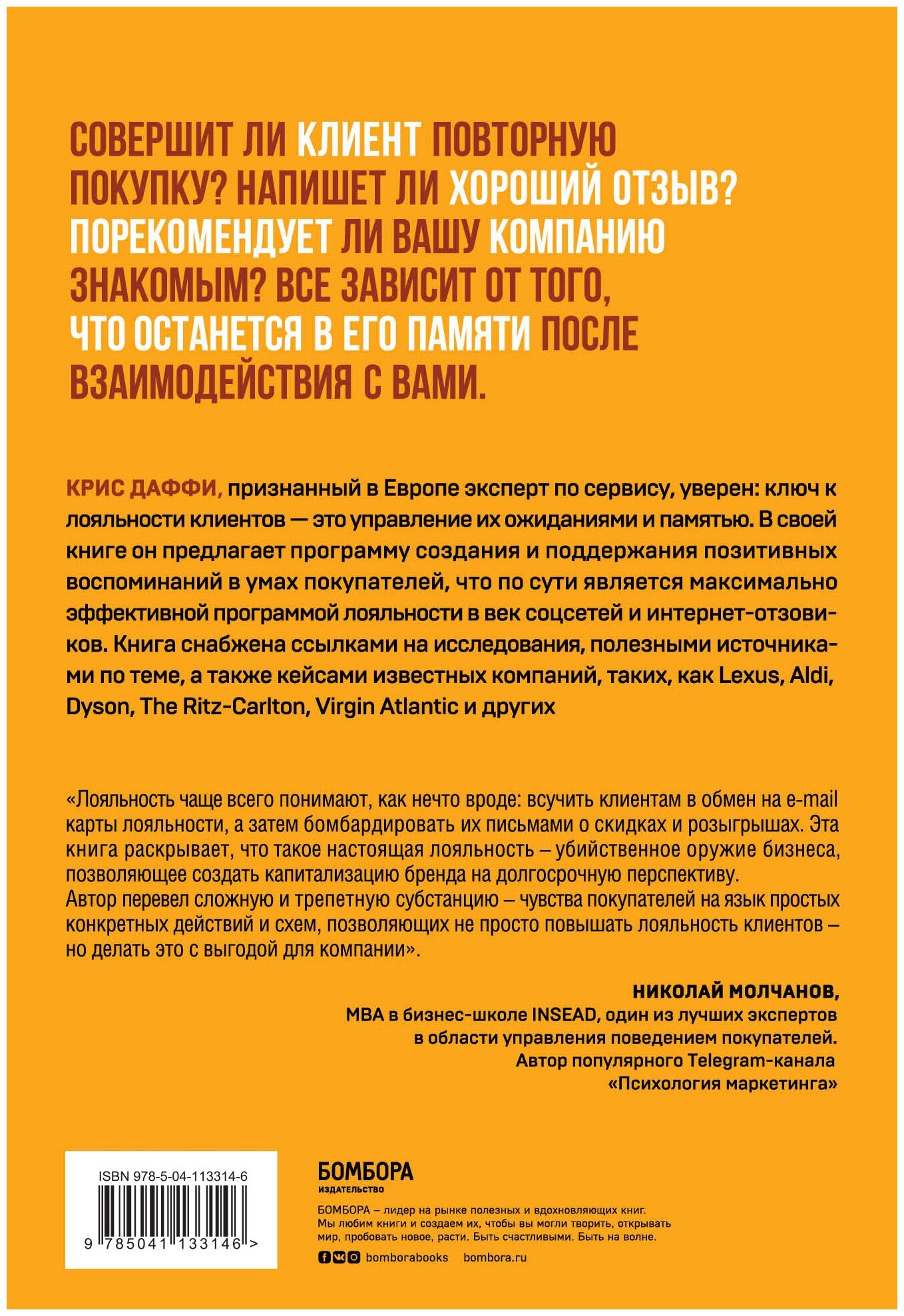 Крис Даффи, признанный в Европе эксперт по сервису, уверен: ключ к лояльности клиентов - это управление их ожиданиями и памятью. В своей книге он предлагает программу создания и поддержания позитивных воспоминаний в умах покупателей, что по сути является максимально эффективной программой лояльности в век соцсетей и интернет-отзовиков. Книга снабжена ссылками на исследования, полезными источниками по теме, а также кейсами известных компаний, таких, как Lexus, Aldi, Dyson, The Ritz-Carlton, Virgin Atlantic и других.