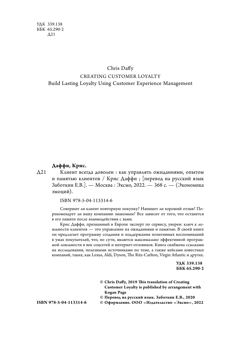 Это лучшее из недавнего о клиентском сервисе, стоит сразу отметить, однако, что название в русском переводе не может полноценно отражать темы, скорее "Клиент всегда доволен" - это маркетинг. Ведь "Creating Customer Loyality" - это целая система мероприятий для выстроения таких отношений с клиентом, которые приводят к его верности вашему бизнесу. Об этом и книга.