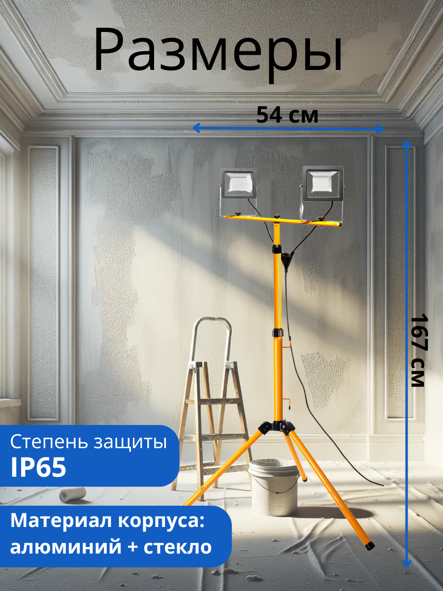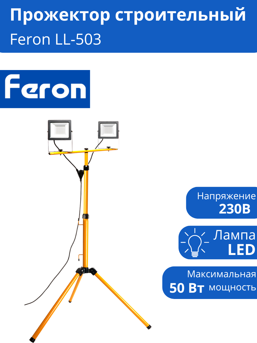 Прожектор светодиодный переносной на штативе, (до) FERON LL-503, 2*50W, 6400К (холодный белый), 230V/50Гц, 9000Lm, IP65, угол рассеивания 120°,*SMD2835, раб. t -40°C - +40°C, цвет черный-желтый, корпус алюминий литой под давлением + стекло, 670*500*1670мм (штатив+ голова) мм Светодиодный прожектор Feron LL-503 на штативе предназначены для освещения строительных объектов, промышленных и торговых площадей. Прожекторы устанавливаются на штатив, что делает их удобными для переноски. Высокая степень защиты IP65, корпус из алюминиевого сплава, покрытие атмосферостойкой эпоксидной эмалью, рассеиватель из калёного стекла и изготовленный из прочной стали штатив, делают прожекторы устойчивыми к агрессивным воздействием окружающей среды.