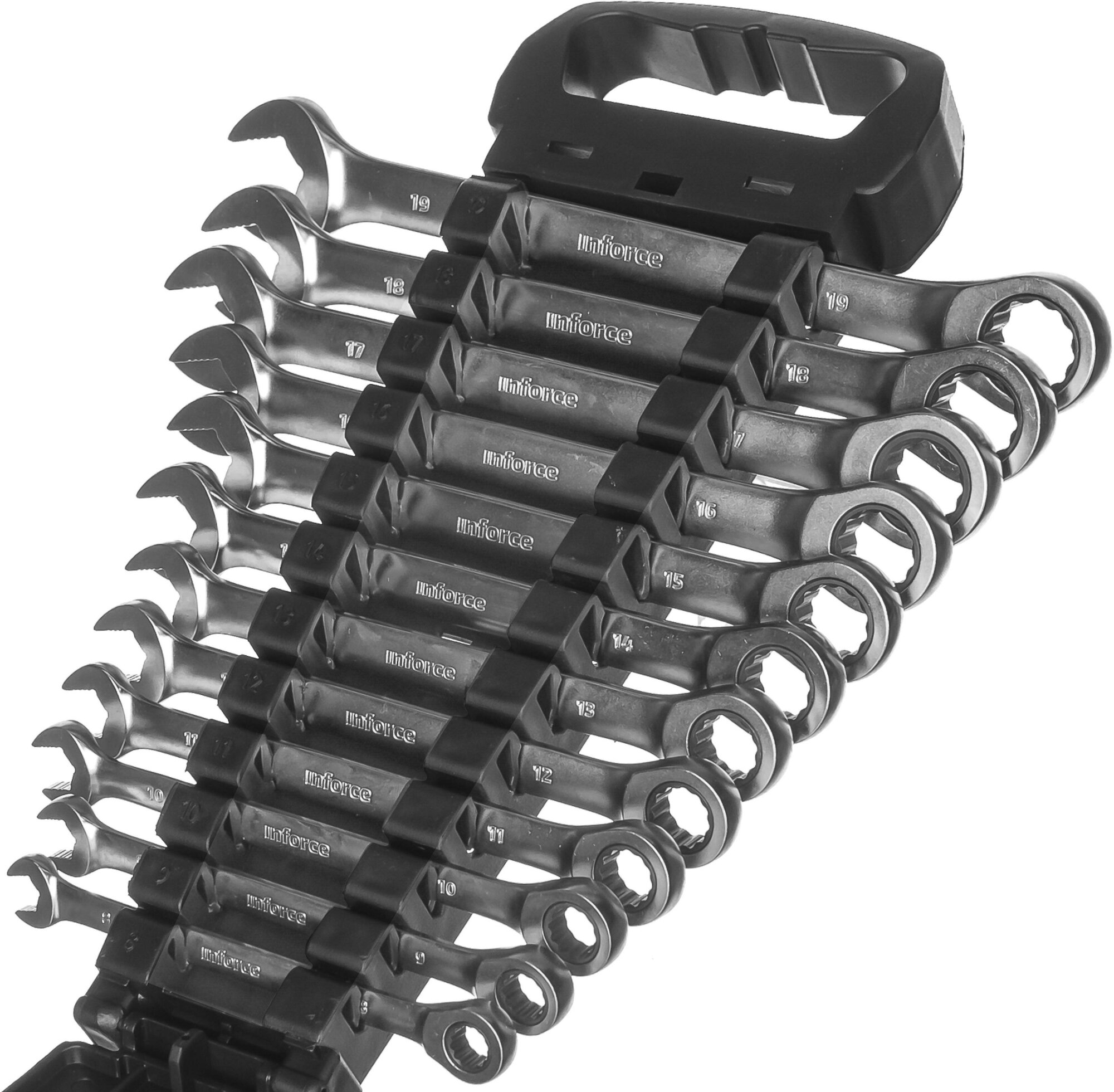 Набор комбинированных ключей с трещоткой 12 предметов Inforce 06-05-49 позволяет работать с крепежом гораздо быстрее. Наличие трещотки на 72 зуба позволяет вращать болты без перехватывания. Присутствует рожковая головка для демонтажа труднодоступного крепежа.