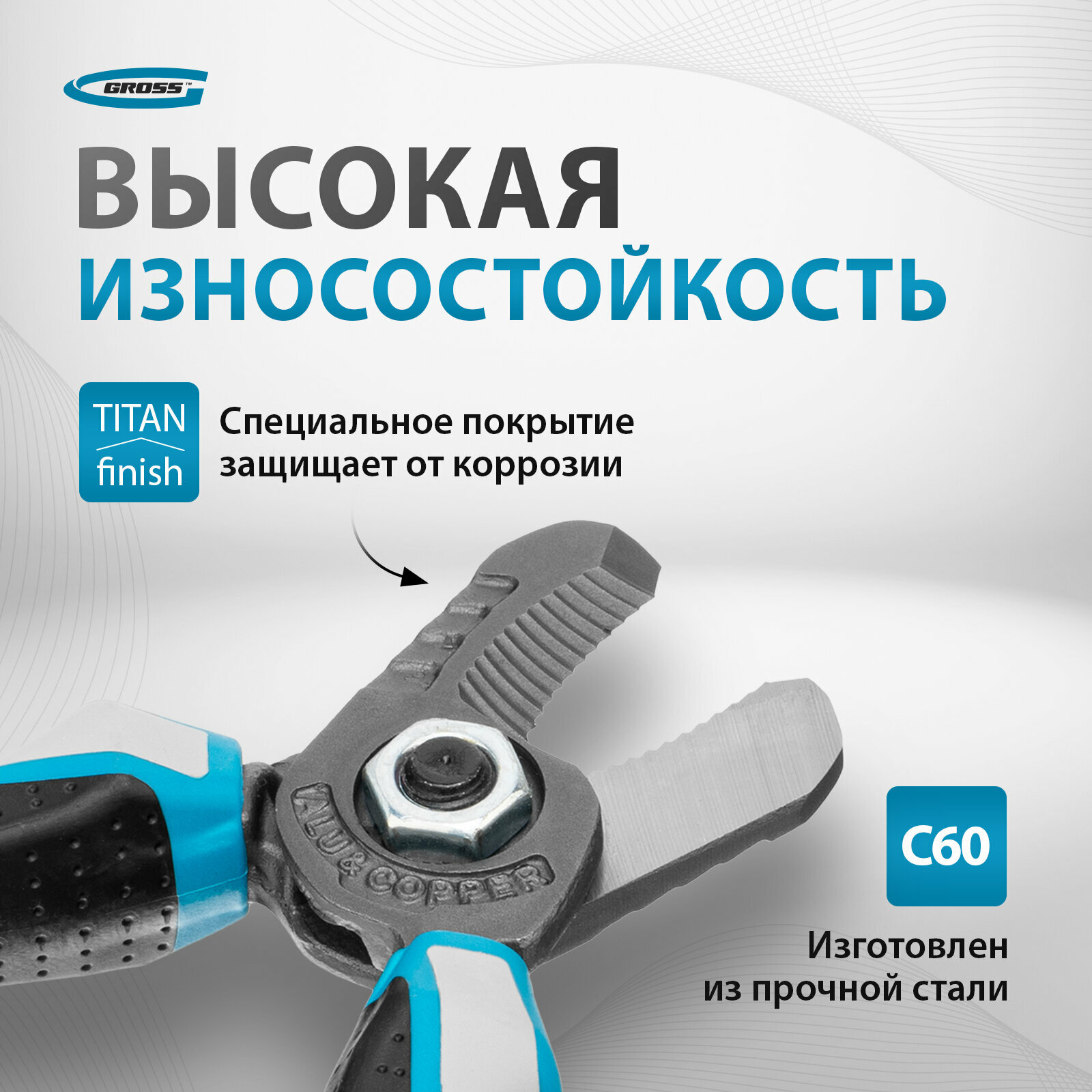 Кабелерез предназначен для широкого спектра электромонтажных работ.ОсобенностиИнструмент используется для снятия изоляции и перерезания медных и алюминиевых кабелей (не подходит для стальной проволоки, алюминиевых сплавов и холоднотянутых медных проводов). Применяется только для многопроволочных жил!!!Закругленный профиль режущих кромок с зубцами препятствует выскальзыванию кабеля и увеличивает эффективность реза.Материал рабочей части сталь марки С60.Только для работ с многопроволочными жилами (медь, алюминий) диаметром до 16 мм или сечением до 50 мм2.Не предназначен для работ со стальной проволокой, алюминиевыми сплавами и холоднотянутыми медными проводами.Эргономичные рукоятки.Специальное антикоррозийное покрытие TITAN finish.5 лет гарантии на заводской брак.
