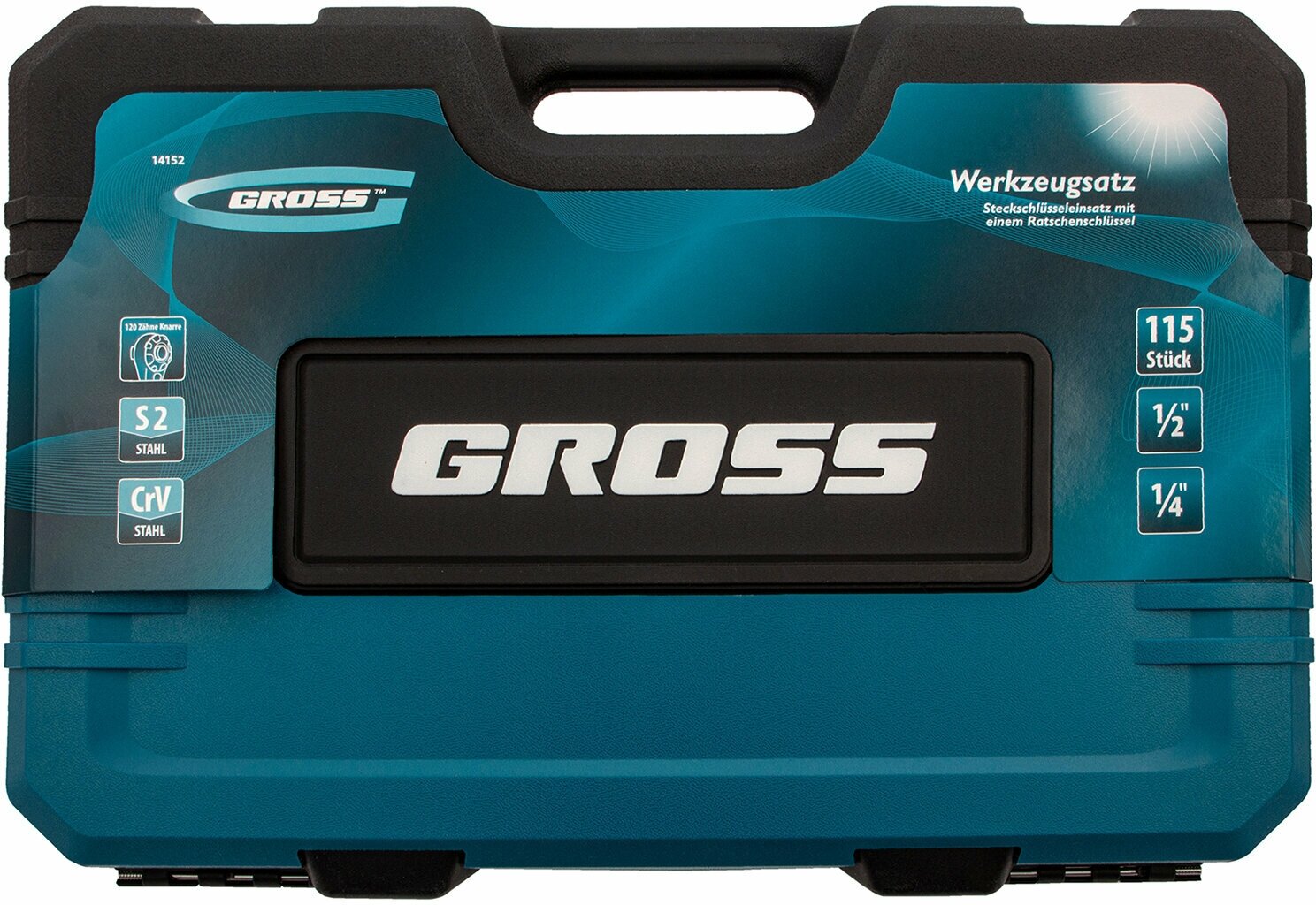 Набор инструментов Gross 14152 включает в себя 115 предметов: отвертки, биты, ключи-трещотки из стали CrV со 120 зубьями, с присоединительным размером 1/4 и 1/2, пассатижи для захвата и удержания плоских деталей, бокорезы, переставные клещи, молоток, зубила (в том числе крейцмейсель) и другие слесарные инструменты. Воротки, удлинители и карданные шарниры облегчают монтаж и демонтаж резьбовых соединений в стесненных условиях. Набор предназначен для работы в гараже и для домашнего ремонта.