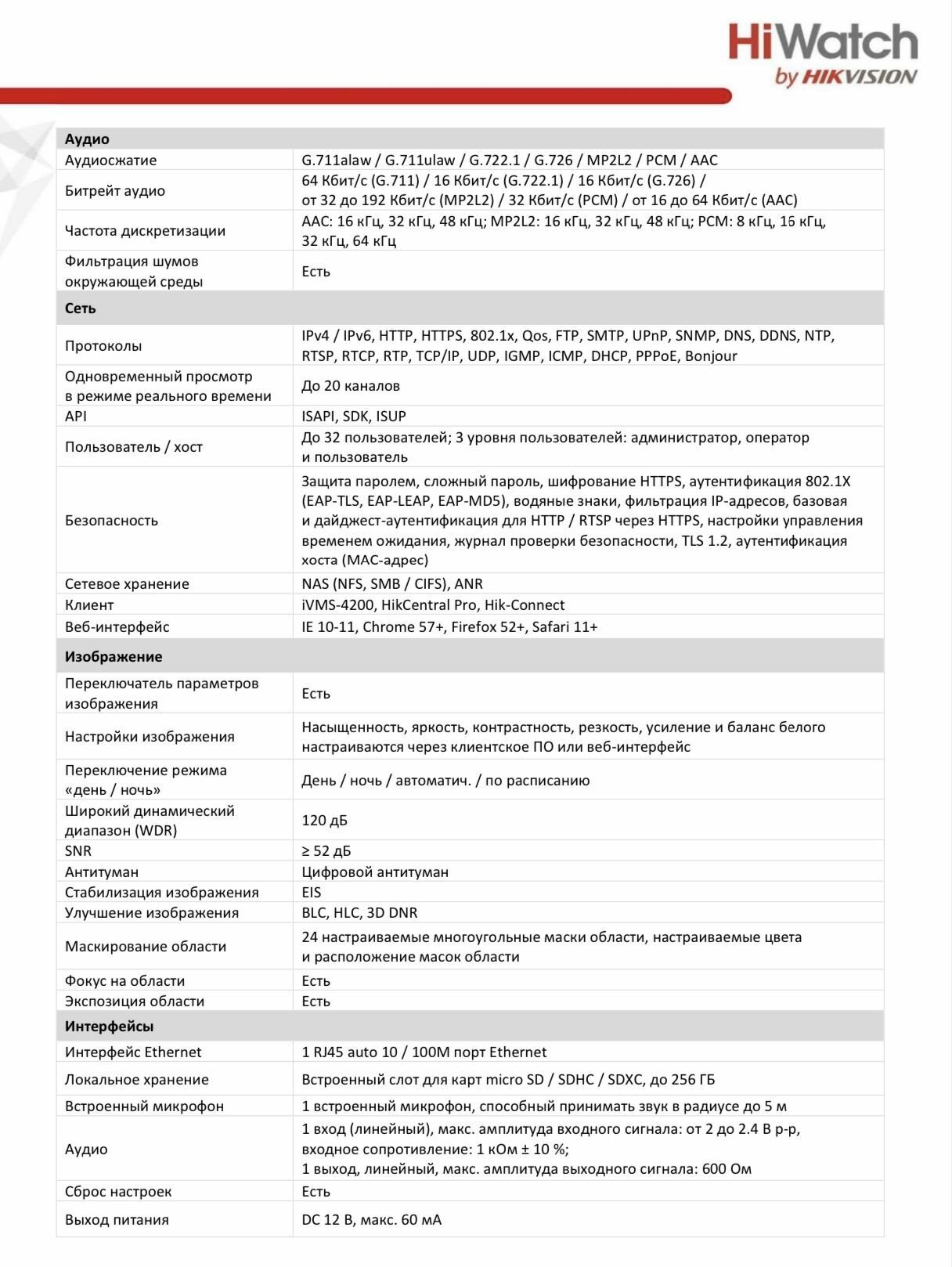 | Аудиокодек? | AAC / G.711alaw / G.711ulaw / G.722.1 / G.726 / MP2L2 / PCM |