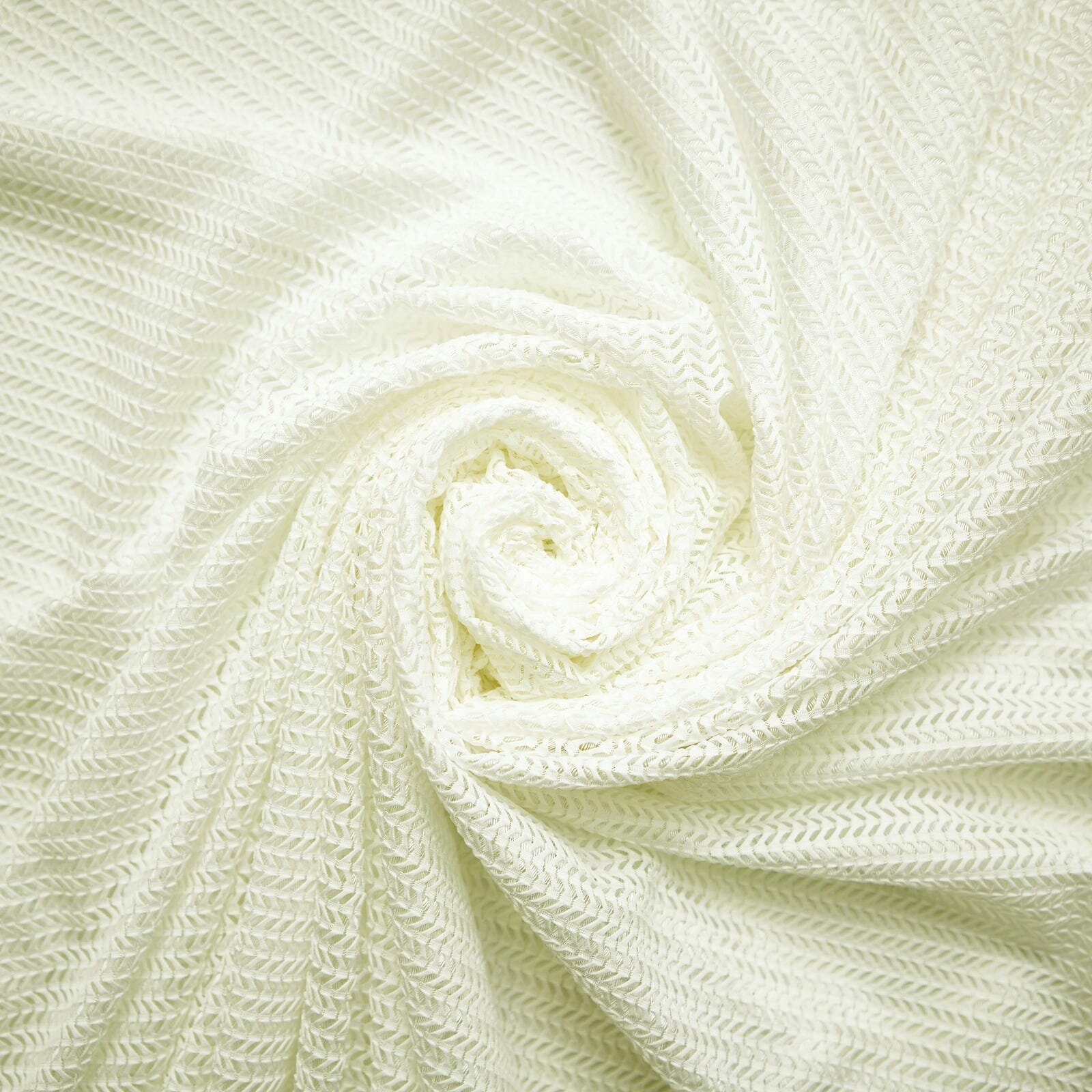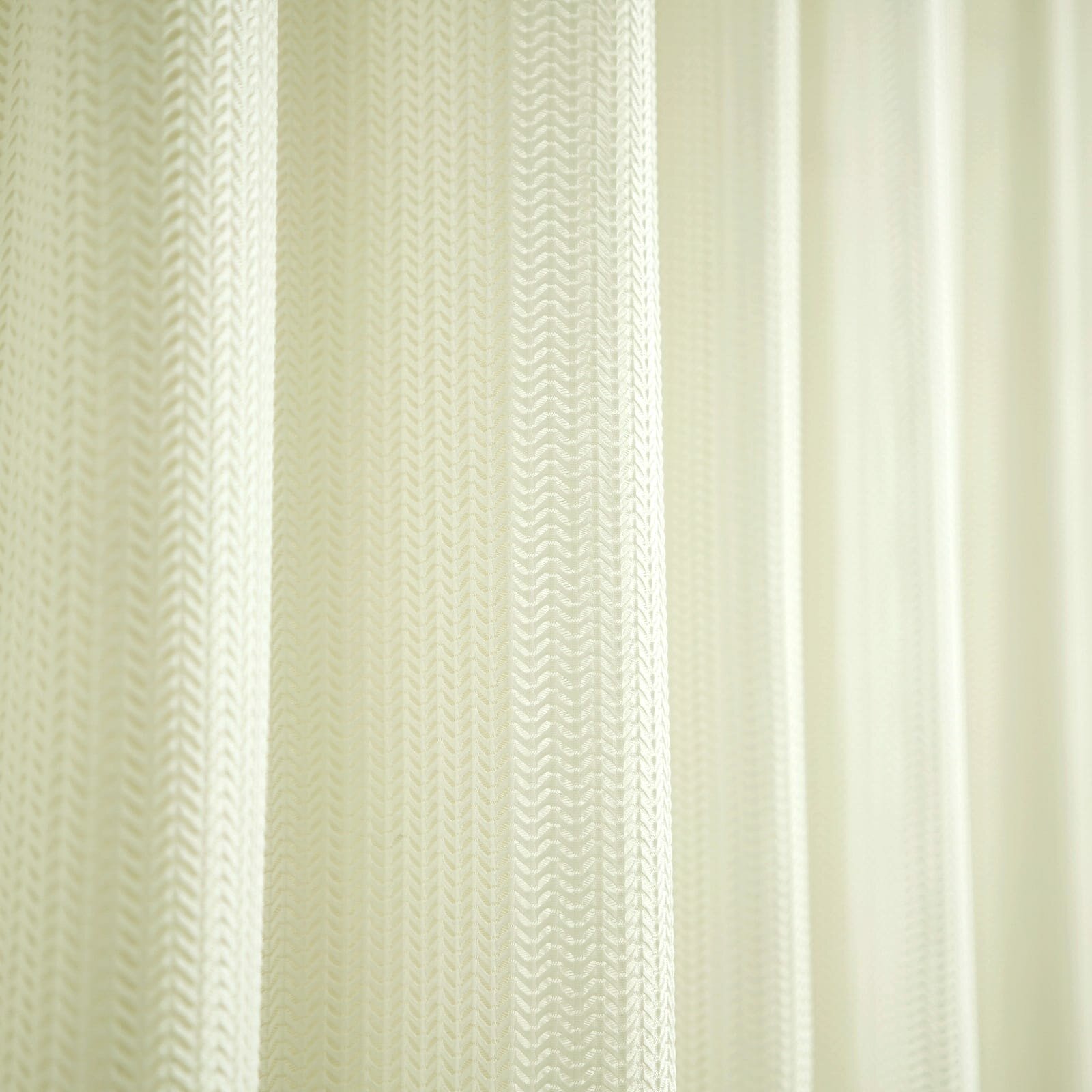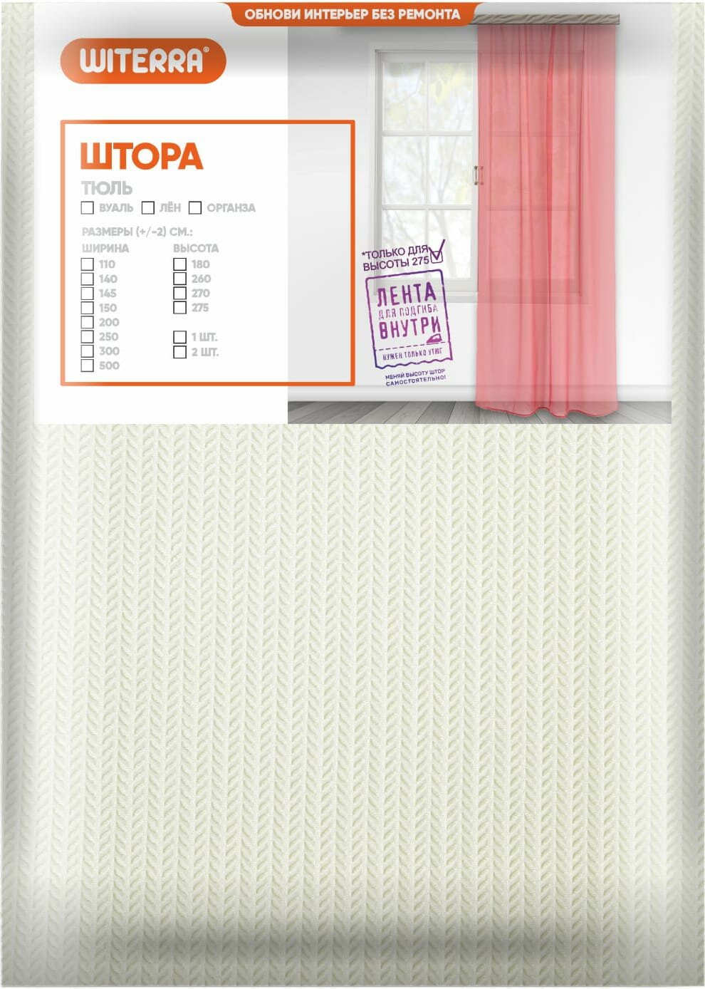 Шторы тюль от WITERRA из коллекции Волна сшиты из трикотажного полотна. Они плотные и, в отличие, от традиционных тюлей, типа вуаль или лён немного тяжелее. Имеет очень необычное зигзагообразное плетение ёлочка. По составу 100% полиэстер.
