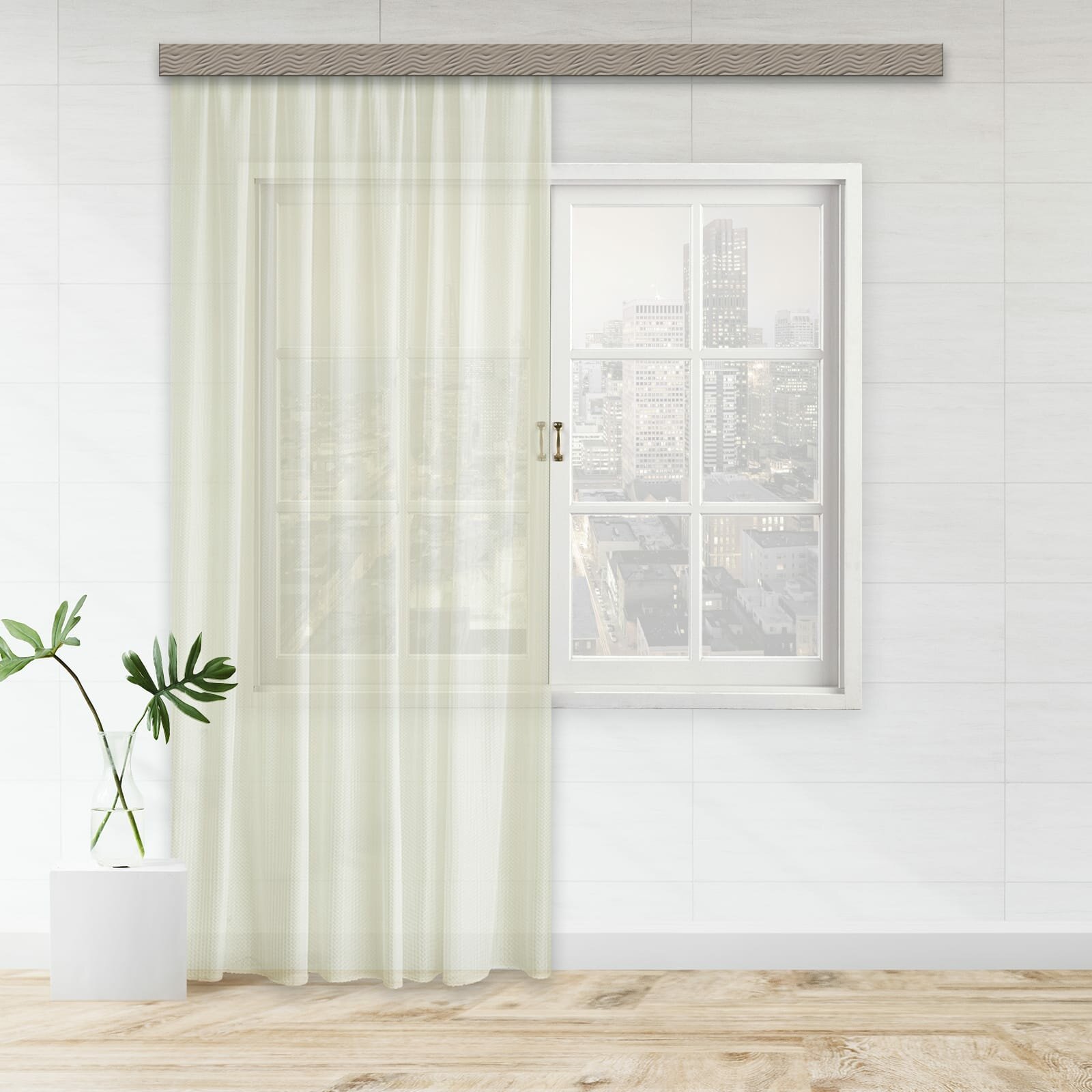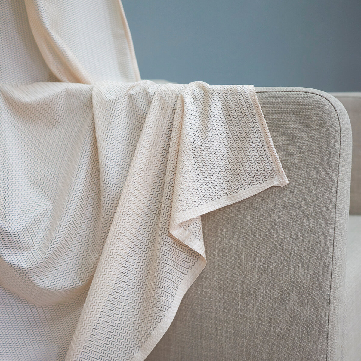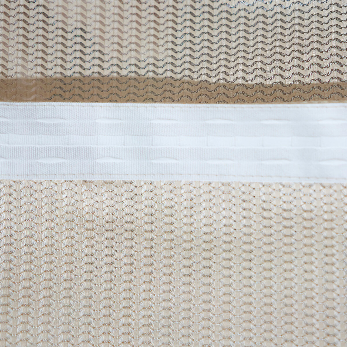 Шторы тюль от WITERRA из коллекции Волна сшиты из трикотажного полотна. Они плотные и, в отличие, от традиционных тюлей, типа вуаль или лён немного тяжелее. Имеет очень необычное зигзагообразное плетение ёлочка. По составу 100% полиэстер.