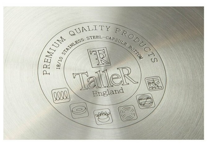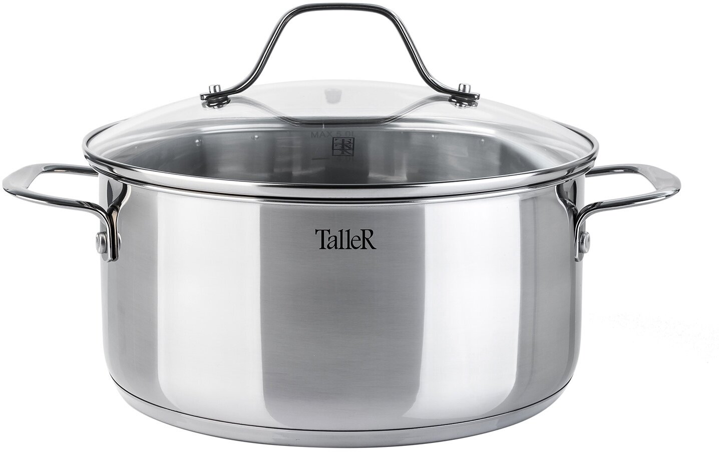 Кастрюля Taller "Элиас" изготовлена из высококачественной нержавеющей стали 18/10 с зеркальной полировкой. Удобные отметки литража на внутренней поверхности посуды позволяют не использовать при приготовлении дополнительную мерную посуду. Капсулированное дно с алюминиевой вставкой обеспечивает идеальное распределение тепла. Крышка из нержавеющей стали и жаропрочного стекла позволяет следить за процессом приготовления, не открывая крышки.