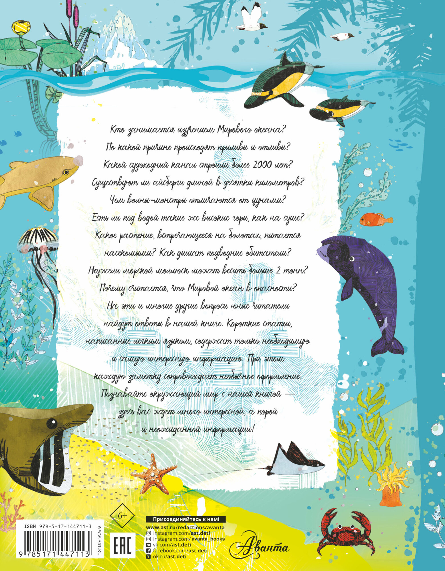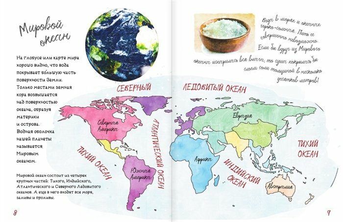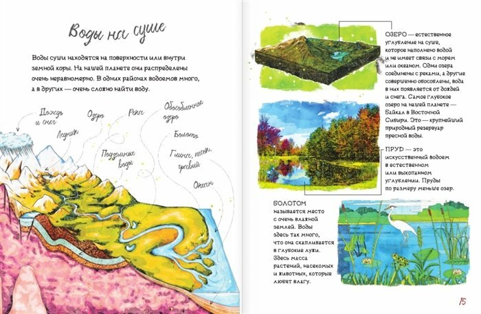 Перелистывая страницу за страницей, юные читатели познакомятся с явлениями гидросферы нашей планеты, особенностями Мирового океана, прочитают увлекательные факты из жизни водных животных и узнают много интересного о растительном мире водоемов. А необычно оформленные статьи непременно привлекут внимание ребят и помогут в усвоении материала.