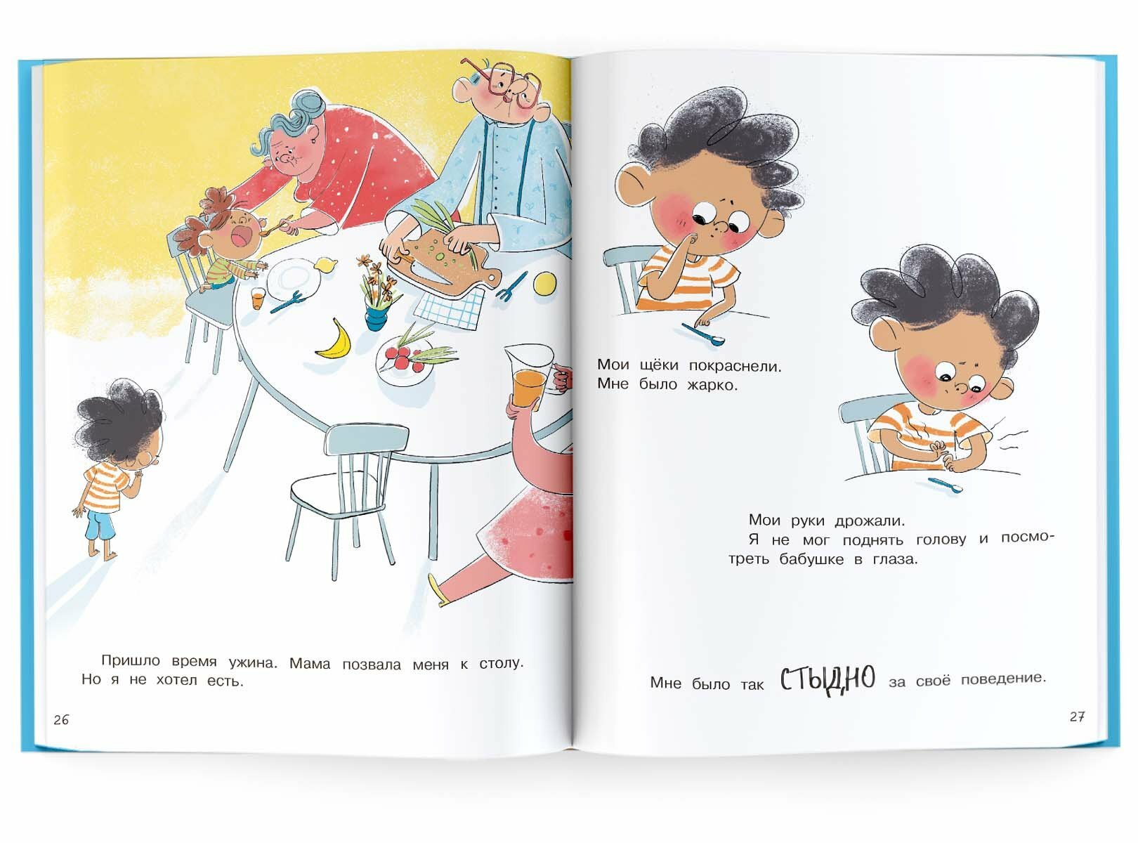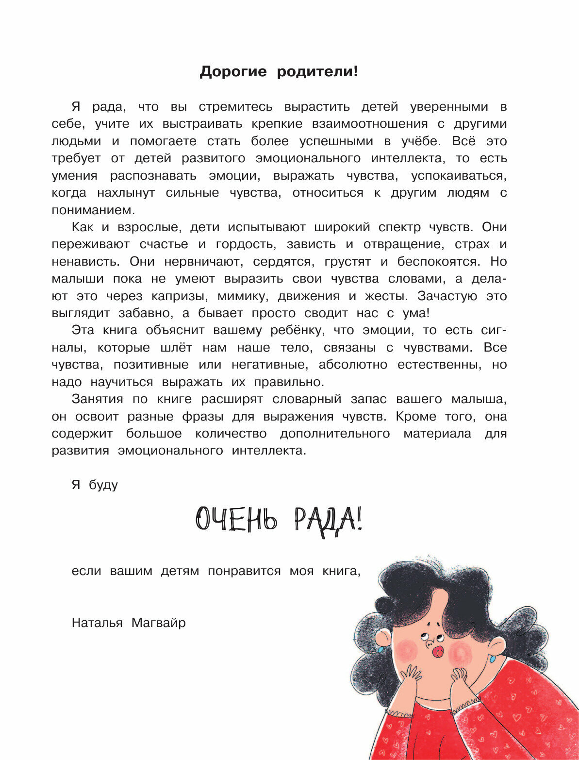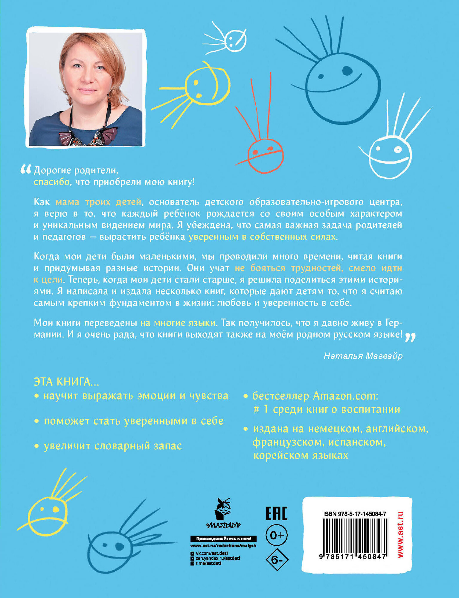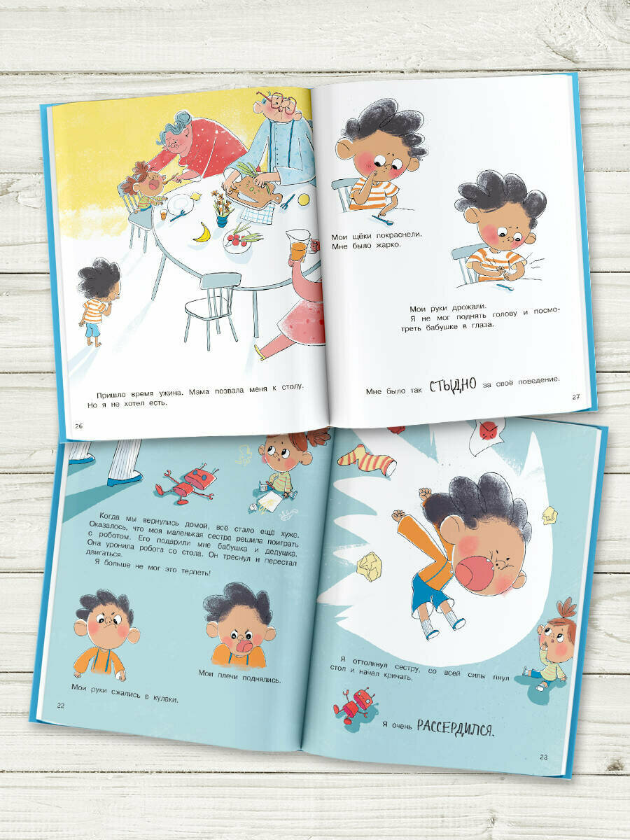 Скептически относилась к книгам про "саморазвитие" для детей. Для взрослых еще понятно, но дети есть дети. Но в последнее время всё чаще стала встречать научные статьи о том, как важно с раннего детства знакомить детей с эмоциями, чтобы они не прятали их в себе или наоборот бесконтрольно не проецировали их во вне. Для первого знакомства сынуле выбрали эту книгу. Чудесные картинки с мальчиком просто не оставили равнодушными ни меня ни сына. Нравится то, что в конце есть небольшая игра и раскраски. Мы довольны на 100%