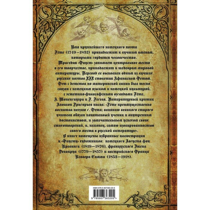 Разочарование. При такой стоимости книги - разочарование. Прекрасная обложка, качественный переплёт. В начале книги большой материал по Гёте, по Фету, как поэту и переводчику. На этом плюсы издания закончились. Из неприятного удивления - бумага и соответственно качество иллюстраций оставляют желать лучшего. Да, бумага не просвечивает, но от ощущения того, что она тонкая газетная избавиться не удалось. Понимаю, что для ценителей творчества как Фета, так и Гёте - это долгожданная книга, но сложилось впечатление, что издательство именно ввиду редкости издания перевода "Фауста" Фетом решило не заморачиваться по такому уже обычному в современном мире вопросу качества бумаги коллекционного издания. Ввиду серости бумаги, качество иллюстрации не впечатлило от слова совсем. Иллюстрации не всегда связаны с текстом, иногда просто старинные гравюры. И есть, на мой взгляд, излишнее украшательство страниц. Оценивать качество перевода не буду, ибо многое уже написано об этом профессионалами на просторах интернета - есть свои особенности лирики Фета, нашедшие отражение и в переводе. И это в любом случае интересно. Но дождусь или другого издания, или скидки минимум 70%.