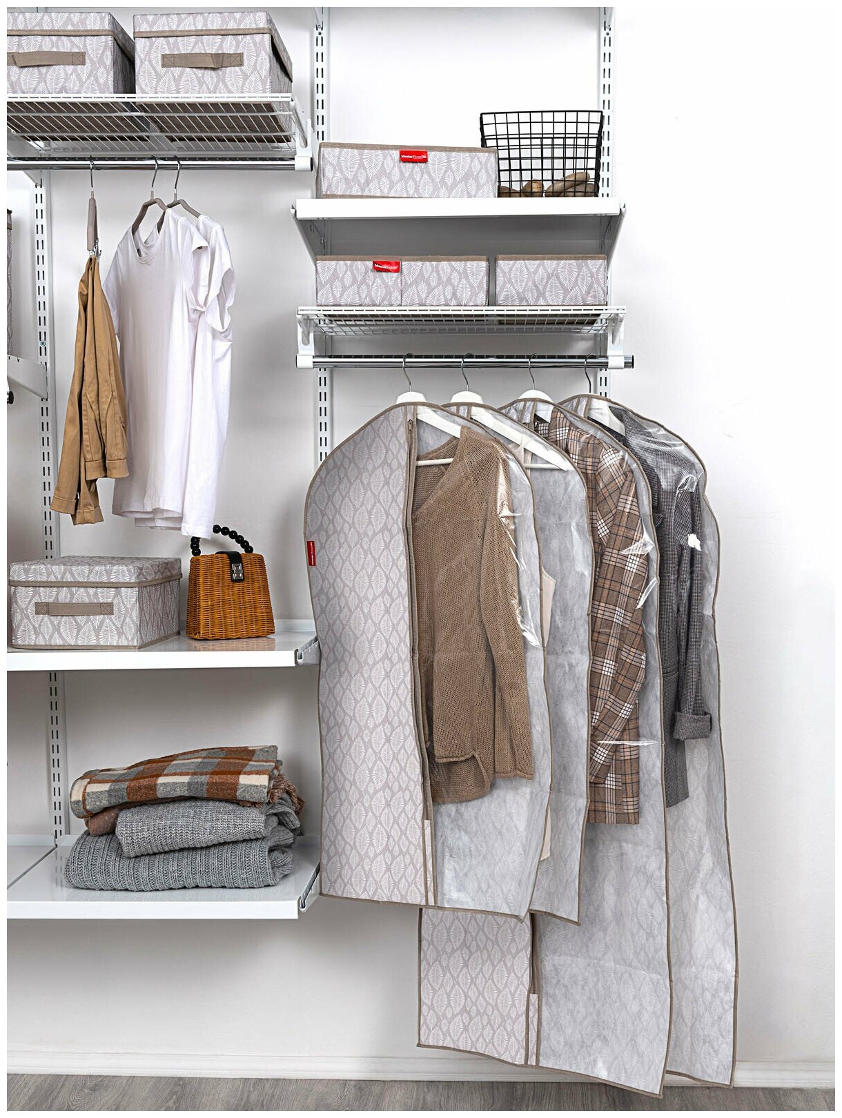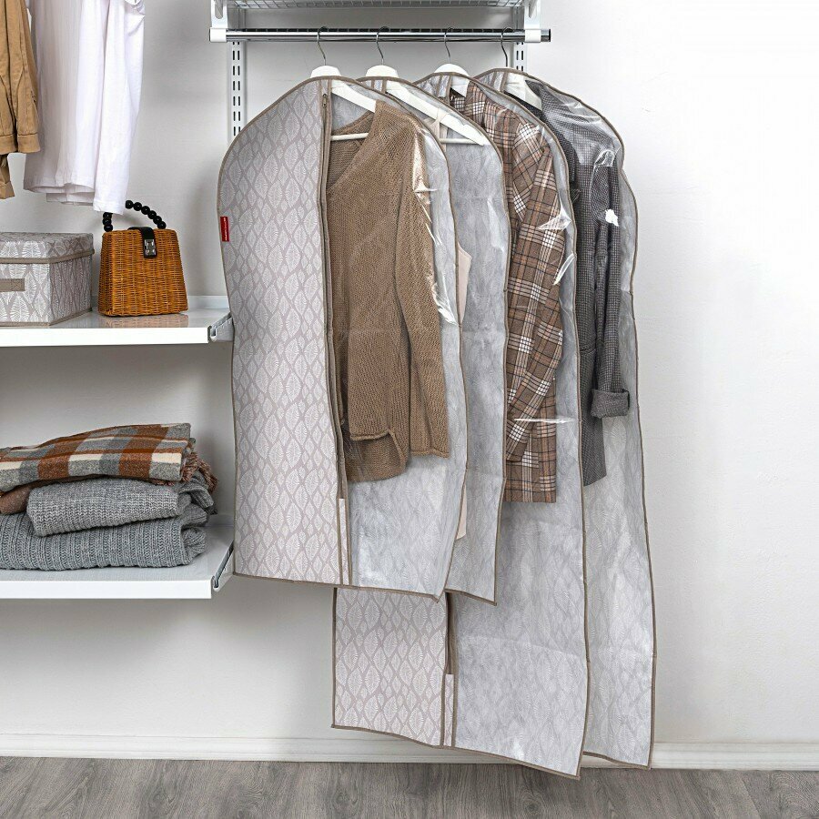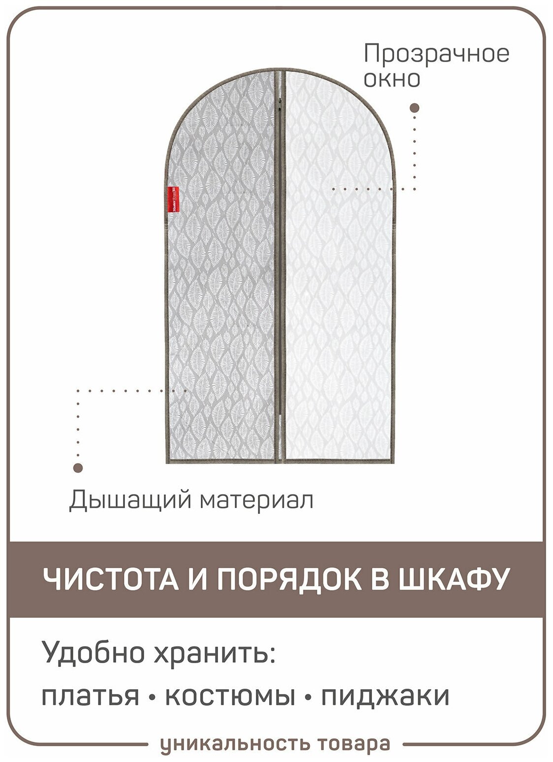 Чехол для одежды Master House 60*100 см с окошком на молнии: бережное хранение и удобство использования.Чехол для одежды Master House 60*100 см предназначен для бережного хранения верхней одежды и костюмов. Изготовлен из плотного нетканого материала, который обеспечивает защиту от грязи и пыли, позволяя вещам "дышать".Прозрачное окно в половину чехла облегчает поиск нужной вещи, не открывая сам чехол. Это особенно удобно при перевозке вещей, когда важно быстро найти нужную вещь.Чехол выполнен в серии "Листья", что придает ему стильный и современный вид. Цвет товара – бежевый, с рисунком в виде листьев, что делает его привлекательным и оригинальным.Особенности чехла на молнии позволяют быстро и легко открывать и закрывать чехол, а также обеспечивают надежное хранение одежды.Выбирая чехол для одежды Master House 60*100 см, вы получаете надежный и удобный аксессуар для хранения и перевозки вашей верхней одежды и костюмов.