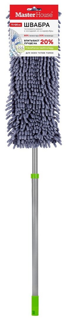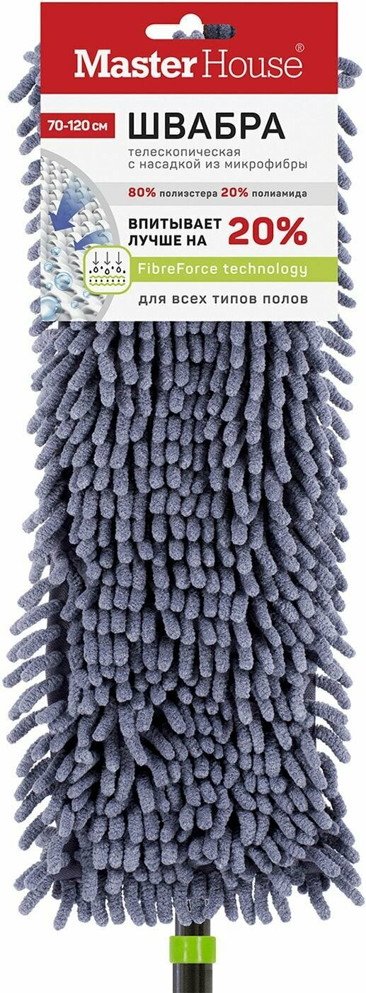 Швабра с телескопической ручкой длиной 70-120см для пола с насадкой из микрофибры. С карманами. Поворотно-наклонный механизм, позволяет легко производить уборку в углах комнат, под шкафами, кроватями и диванами. Микрофибра притягивает и удерживает частицы пыли за счет безупречных электростатических свойств материала. Может быть использована для сухой и влажной уборки для различных материалов поверхности. Впитывает на 20% лучше. Размер рамки 39,5*9 см, размер насадки с микрофибровой рабочей частью 43*13 см. Состав (материал): металл, пластик, микрофибра (80% полиэстер, 20% полиамид). Для всех типов полов.