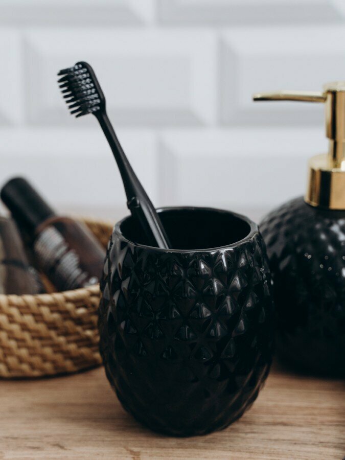 Стакан для зубных щеток BLACK - стильный аксессуар, который в удобной форме хранит зубные щетки и пасту. Он выполнен из благородного черного фарфора с глянцевой рельефной поверхностью. Устойчивое и нескользящее дно позволит поставить стакан, как на полку, так и на умывальник.Вся коллекция аксессуаров BLACK отличается эффектным дизайном за счет выигрышной комбинации черного и золотого цветов. Сочетание черного глянца и золотого декора подходит под классический, ретро и современный интерьер.Кроме того фарфор – это практичный, экологически безопасный материал, устойчивый к механическим воздействиям, к действию бытовых моющих средств, не впитывает запахи и влагу. Все предметы коллекции BLACK изготовлены вручную, легко моются и не теряют эстетичный внешний вид при частом применении.Стакан для зубных щеток надежно упакован в индивидуальную подарочную коробку.Эстетика и гигиена в доме начинаются с мелочей. Украсьте свою ванную комнату другими предметами коллекции BLACK: дозатором для жидкого мыла и мыльницей.