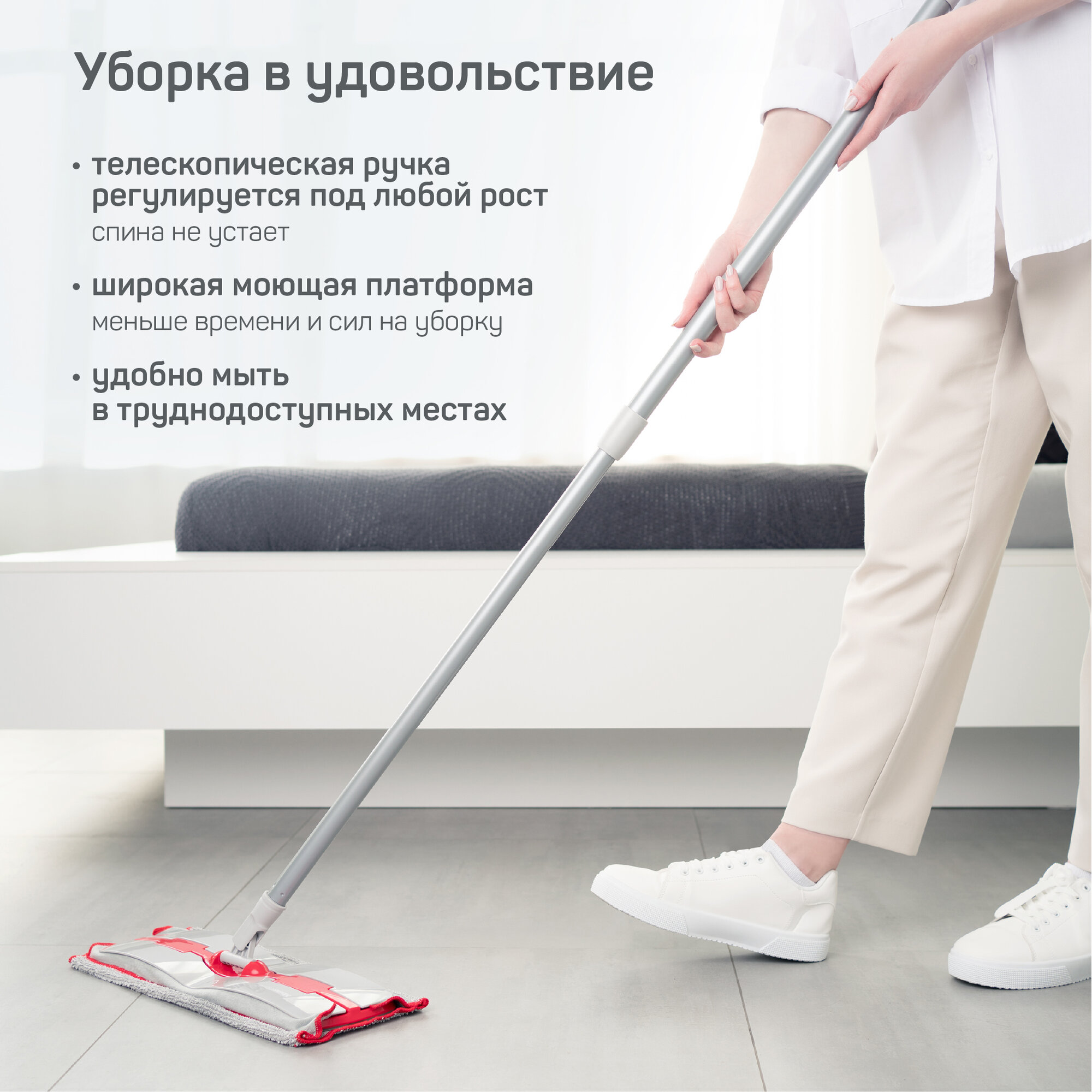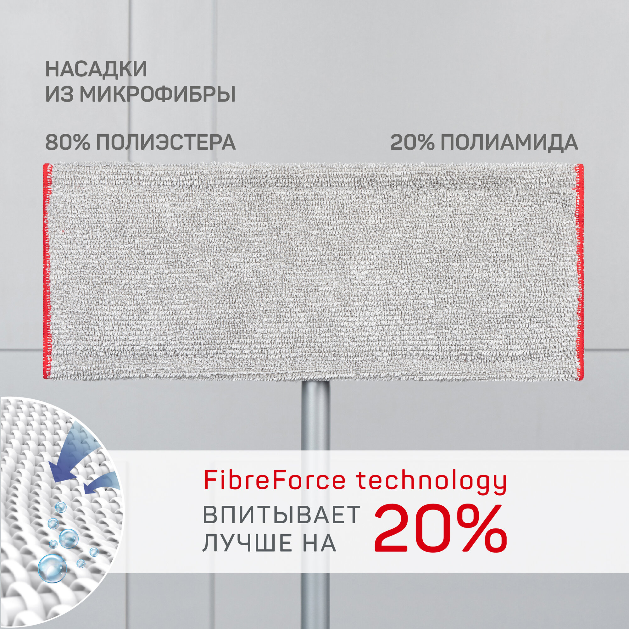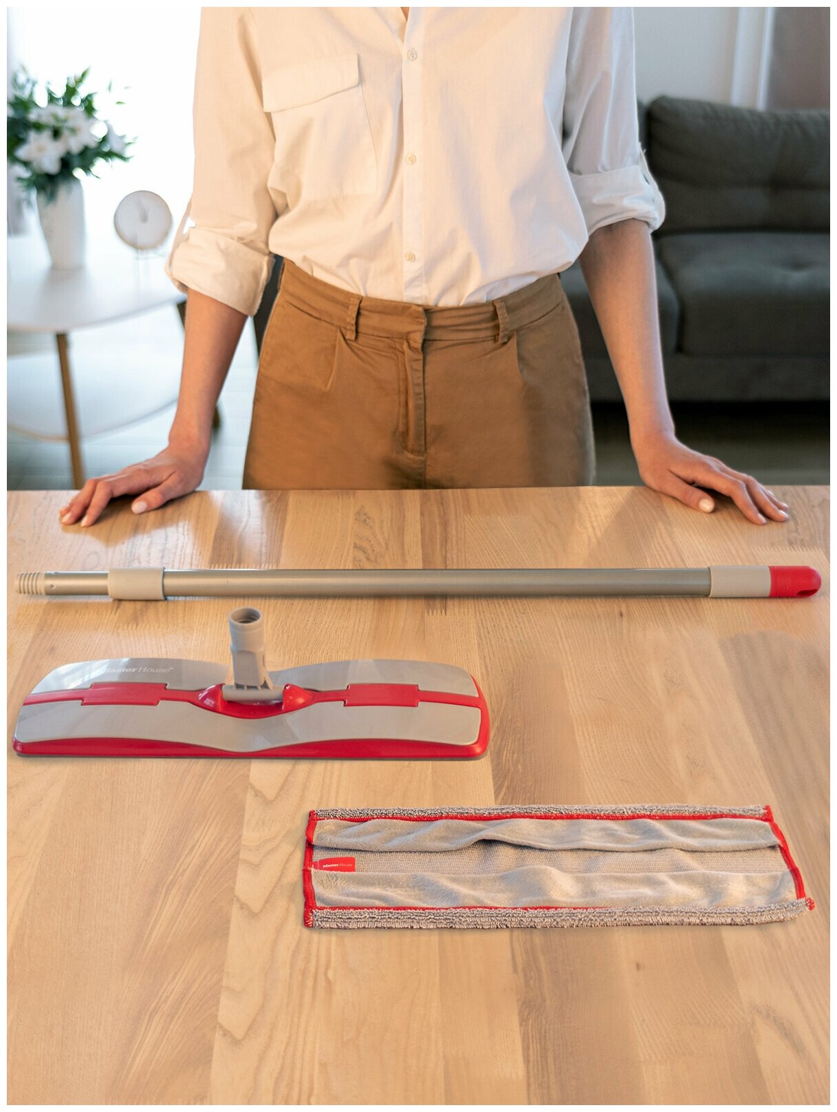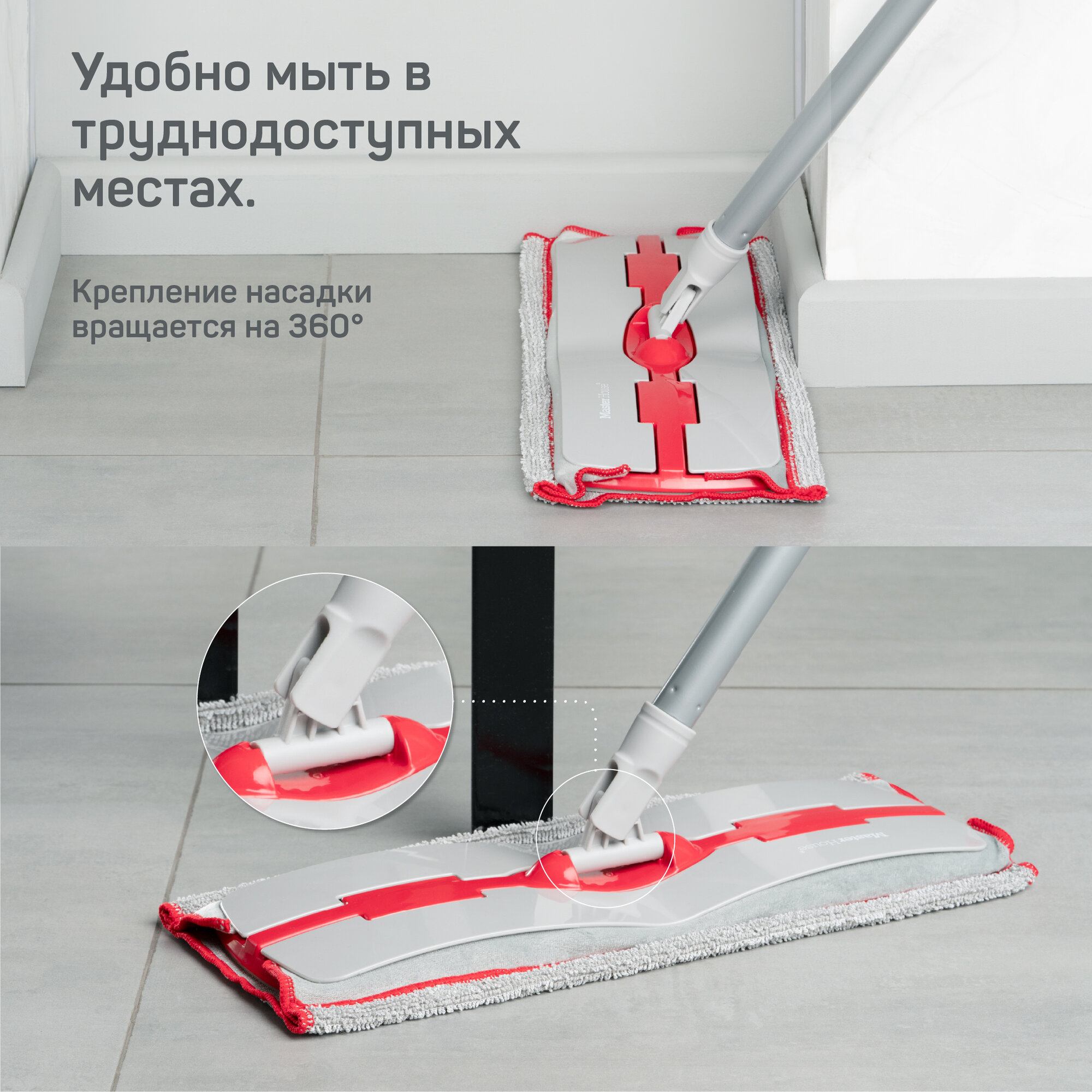Швабра с удобным способом крепления насадки - зажим. Телескопическая ручка 78-128 см. Насадка из микрофибры по стандарту FibreForce technology впитывает воду на 20% эффективнее, легко оттирает загрязнения, не оставляет разводов на полу, отлично притягивает волосы и пыль. Можно стирать в стиральной машине! Размер насадки 40*20см. Вращающееся крепление насадки. Удобно мыть в труднодоступных местах. У Master House есть все, что может сделать уборку дома легкой и необременительной работой.