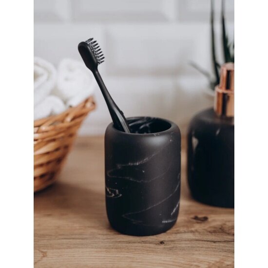 Стакан для зубных щеток MARBLE - это стильный аксессуар для удобного хранения зубных щеток и кисточек для макияжа. По цвету и фактуре он напоминает черный мрамор с белыми прожилками, однако изготовлен из полимерного материала полирезина, сочетающего преимущества натурального камня и пластмассы.Благодаря низкой теплопроводности предметы из полирезина на ощупь теплые и приятные. Изделия из полирезина настолько прочные, что не разобьются от случайного падения. Непористая структура полирезина обеспечивает устойчивость к развитию плесени и микробов. Полирезин - идеальный материал для аксессуаров для ванной комнаты: экологичный, устойчивый к механическим и термическим воздействиям, не впитывающий запахи и влагу, непритязательный в уходе.Стакан выполнен в виде цилиндра с закруглёнными краями. За счет веса он очень устойчивый.Стакан упакован в индивидуальную подарочную коробку.Дополните интерьер своей ванной комнаты другими предметами коллекции MARBLE: дозатором для жидкого мыла, мыльницей, ершиком для унитаза со стаканом.