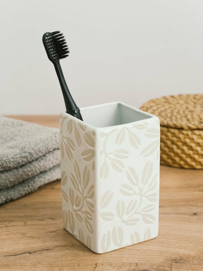 Стакан для зубных щеток LEAF из фарфора имеет строгую геометрическую форму. Его украшает природный принт «листья» и необычное сочетание глянцевой и матовой фактур.Фарфор - материал экологически безопасный, устойчивый к механическим воздействиям, не впитывает запахи и влагу. Все аксессуары для ванной из коллекции LEAF изготовлены вручную, легко моются и не теряют эстетичный внешний вид при частом применении. Устойчивая форма стакана позволяет поставить его, как на полку, так и на умывальник.Стакан для зубных щеток надежно упакован в индивидуальную подарочную коробку.Дополните интерьер своей ванной комнаты другими предметами коллекции LEAF: дозатором, и мыльницей.