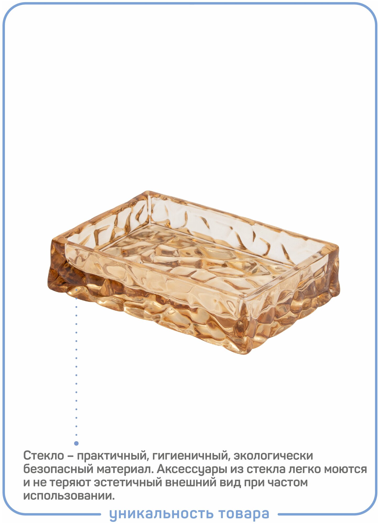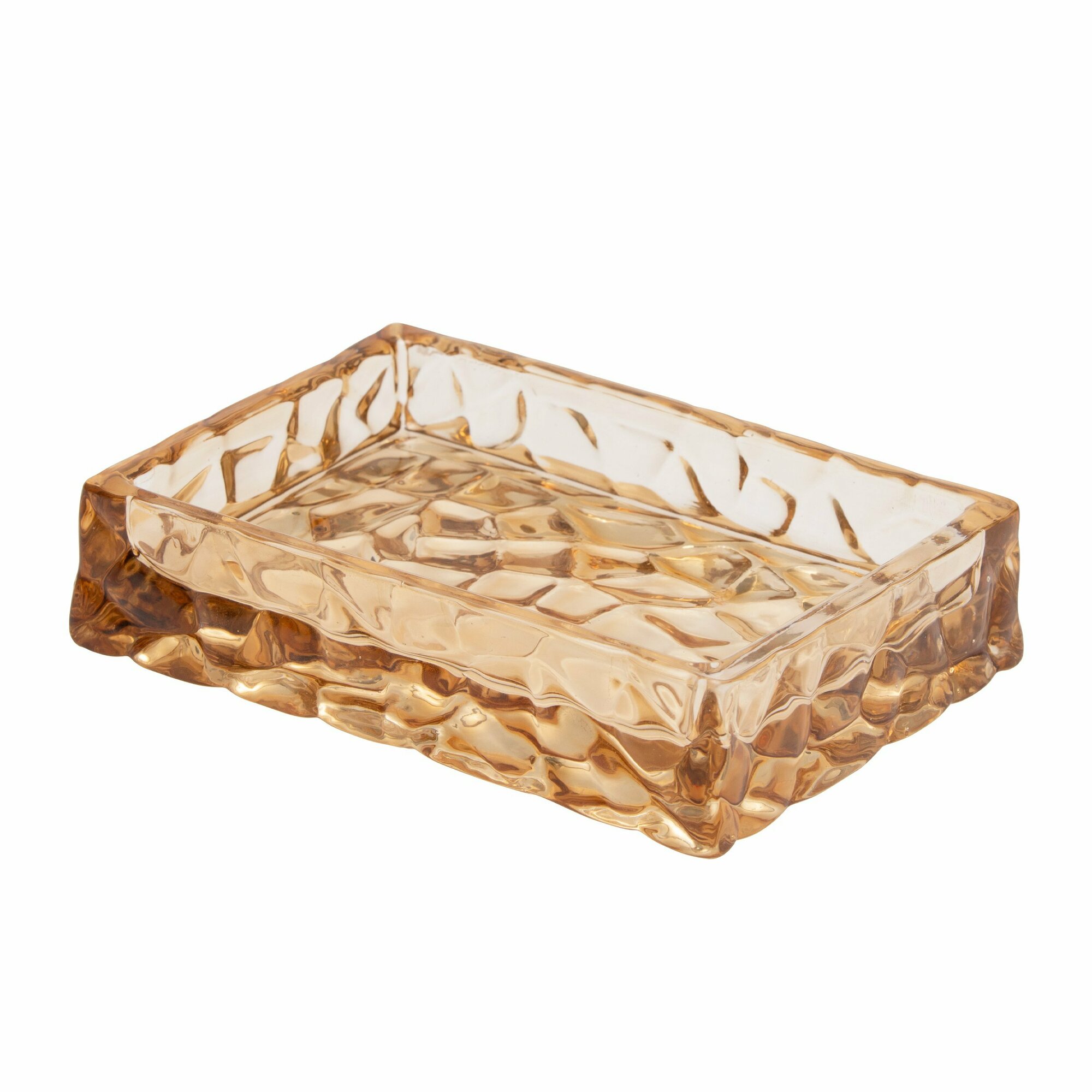 Мыльница Jack-stone для удобного хранения твердого мыла в ванной комнате. Роскошный внешний вид всем предметам коллекции Jack-stone придает сочетание янтарного цвета, глянцевых поверхностей и четких геометрических форм.Мыльница выполнена из стекла повышенной прочности с абстрактным рельефным рисунком. Стекло – практичный, гигиеничный, экологически безопасный материал, который не впитывает запахи, влагу. Стеклянные изделия легко моются и не теряют эстетичный внешний вид при длительном использовании.Мыльница упакована в индивидуальную подарочную коробку.Дополните интерьер своей ванной комнаты другими предметами коллекции Jack-stone: дозатором для жидкого мыла и стаканом для зубных щеток.