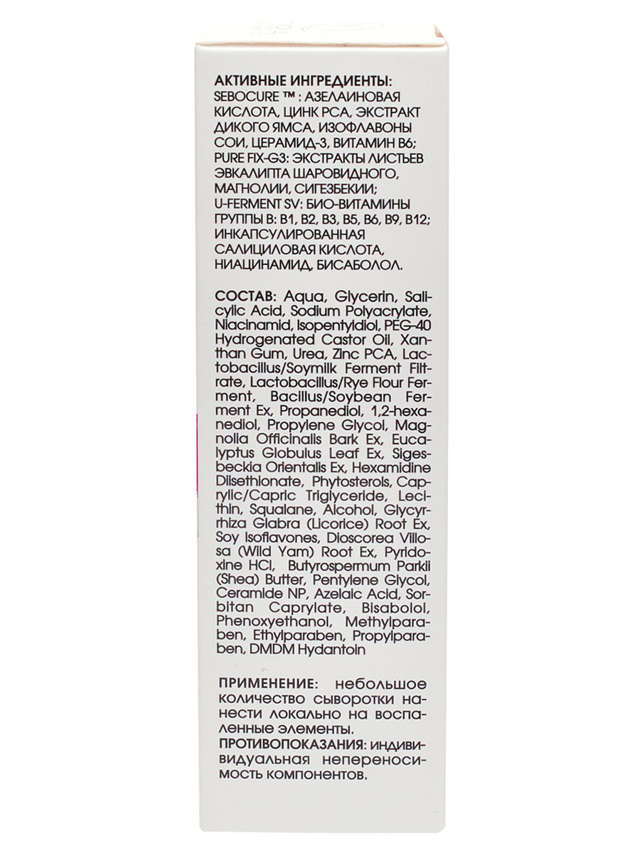 Состав: aqua, glycerin, salicylic acid, sodium polyacrylate, niacinamid, isopentyldiol, peg-40 hydrogenated castor oil, xanthan gum, urea, zinc pca, lactobacillus/soymilk ferment filtrate, lactobacillus/rye flour ferment, bacillus/soybean ferment extract, propanediol, 1,2-hexanediol, phytosterols, caprylic/capric triglyceride, lecithin, squalane, alcohol, glycyrrhiza glabra (licorice) root extract, soy isoflavones, dioscorea villosa (wild yam) root extract, pyridoxine hcl, butyrospermum parkii (shea) butter, pentylene glycol, ceramide np, azelaic acid, sorbitan caprylate, bisabolol, phenoxyethanol, methylparaben, ethylparaben, propylparaben, dmdm hydantoin.