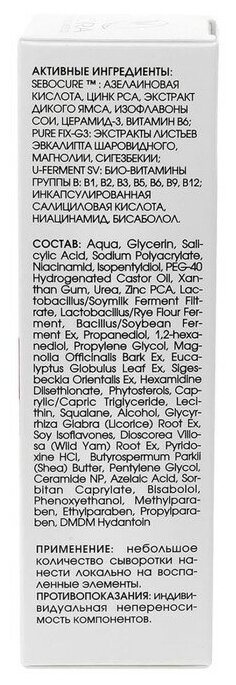 Азелаиновая кислота, цинк РСА, экстракт дикого ямса, изофлавоны сои, церамид-3, витамин В6; экстракты эвкалипта шаровидного, магнолии, сигезбекии, гексамидина диизотионат, био-витамины группы В: В1, В2, В3, В5,В6, В9, В12; инкапсулированная салициловая кислота, ниацинамид, бисаболол.