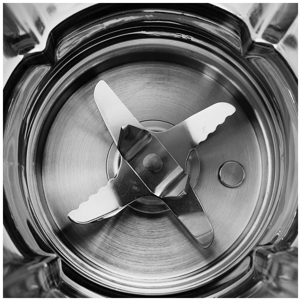 | Прочие свойства и особенности | Блендер оснащен вместительной стеклянной чашей емкостью 1,2 л с мерной шкалой. В крышке чаши есть специальное отверстие, закрываемое мерным колпачком, для добавления ингредиентов непосредственно во время работы. Емкость мерного колпачка — 50 мл. Им можно отмерять и добавлять ингредиенты в чашу, как до готовки, так и во время. |