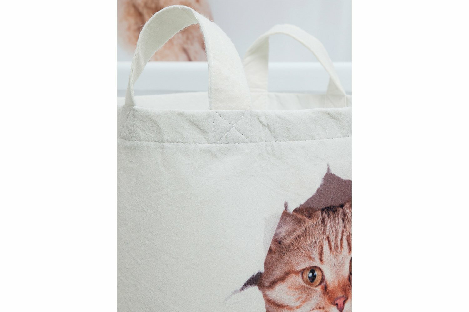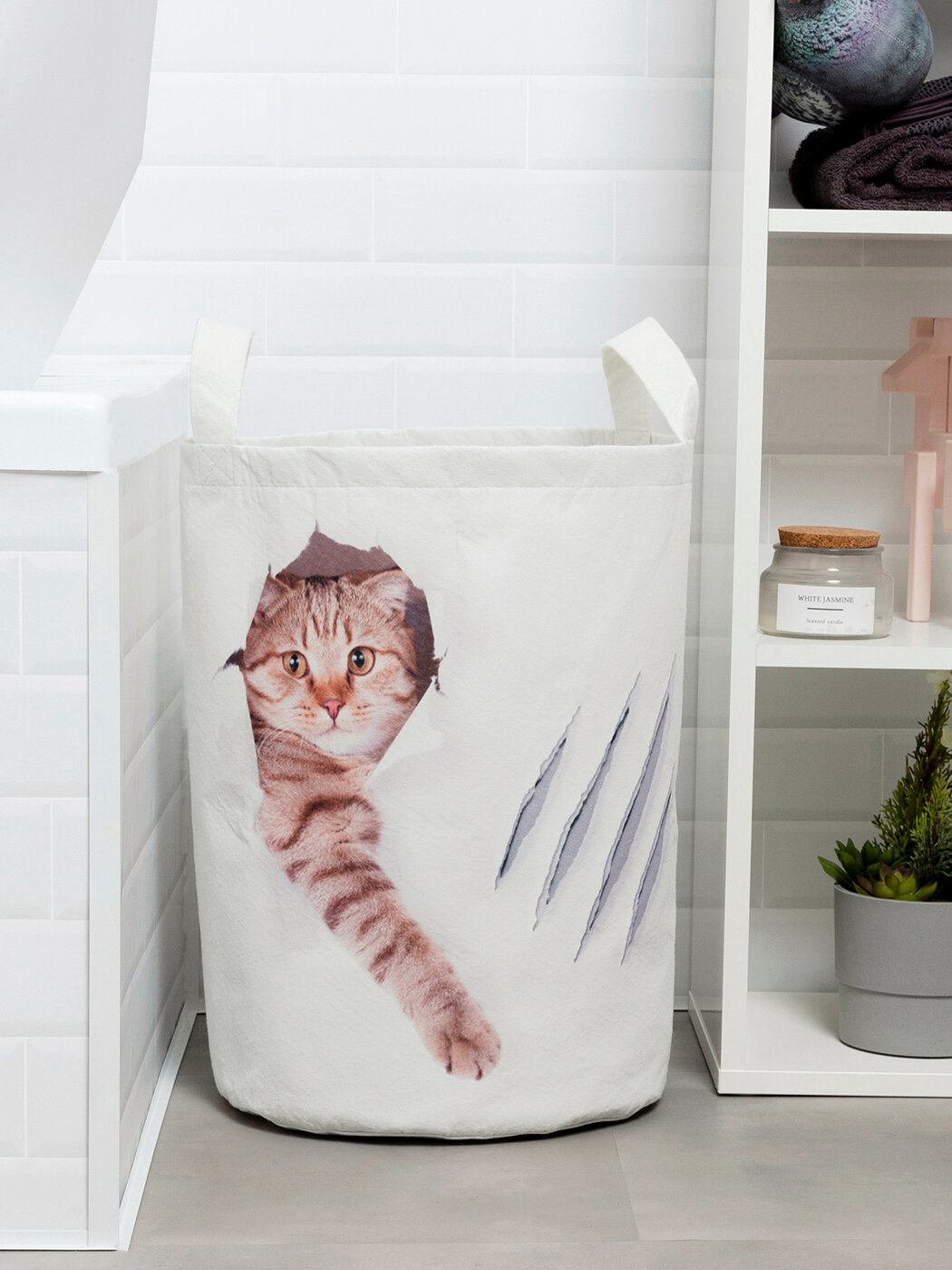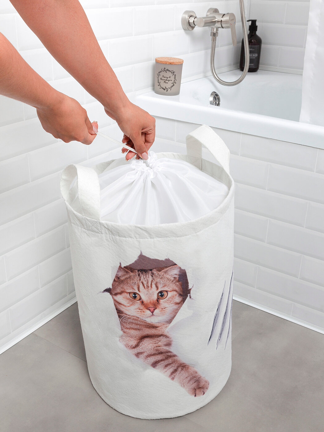 Многие хозяйки сетуют, что им некуда складывать предназначенное для стирки бельё, но громоздкие пластмассовые бельевые короба покупать не спешат. Действительно, визуально они делают ванную комнату меньше, причем всегда будут теснить вас, даже оставаясь свободными. Этих недостатков лишена мягкая корзина для вещей "Кот с царапиной", пошита из прочной и не мнущейся ткани – войлок. Если всё бельё перестирано, её можно просто сложить и отправить на хранение в шкафчик. Продолжая сравнение с традиционными вариантами, следует отметить, что ни один пластмассовый ящик не способен хоть как-то украсить интерьер ванной комнаты. Зато декорированная оригинальным принтом корзина для хранения белья будет отлично смотреться на фоне даже самой изысканной коллекции кафельной плитки.