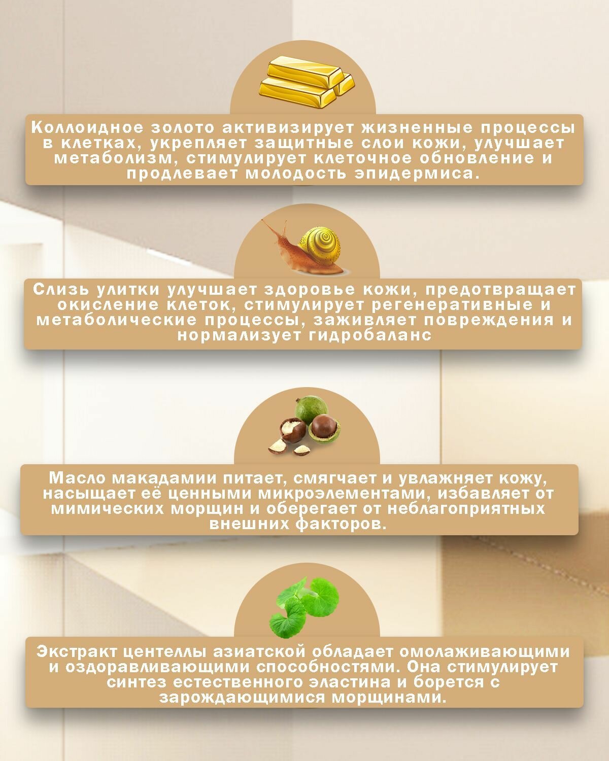 Интенсивное омолаживающее средство, с экстрактом слизи улитки и с коллоидным золотом.