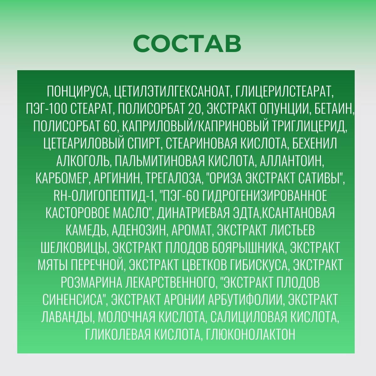 Состав | Вода, Экстракт корья Анемаррены асфоделовидной, Гидрированный полидвцен, Метилгпюцет-20. Глицерин, Бутилен Гликоль, Ниациамид, 1 2-Гександиол, Циклогексасилоксан, Диметикон, Глицерет-26, Гиалуронат натрия, Эстракт центеллы Азиатский, (Подсолнечник) Масло семян, Эстракт плодов понцируса, Цетилэтилгексаноат, Глицерилстеарат, ПЭГ-100 Стеарат, Полисорбат 20, Экстракт Опунции, Бетаин, Полисорбат 60, Каприловый/каприновый триглицерид, Цетеариловый спирт, Стеариновая кислота, Бехинил Алкоголь, Пальмитиновая Кислота. Аплантоин, Карбомер, Аргинин, Трегалоза, Ориза Экстракт Сативы, RH-Олигопептид-1, ПЭГ-60 Гидрогенизированное Касторовое масло, Динатриеевая ЭДТА, Ксантановая камедень, Аденозин, Аромат, Экстракт листьев шелковицы, Экстракт плодов боярышника, Экстракт Мяты перечной, Экстракт цветков гибискуса, Экстракт розмарина лекарственного, Экстракт плодов Сененсиса, Эстракт Аронии арбутифолии, Экстракт Лаванды, Молочая кислота, Салициловая кислота, Гликолевая кислота, Глюконолактон |