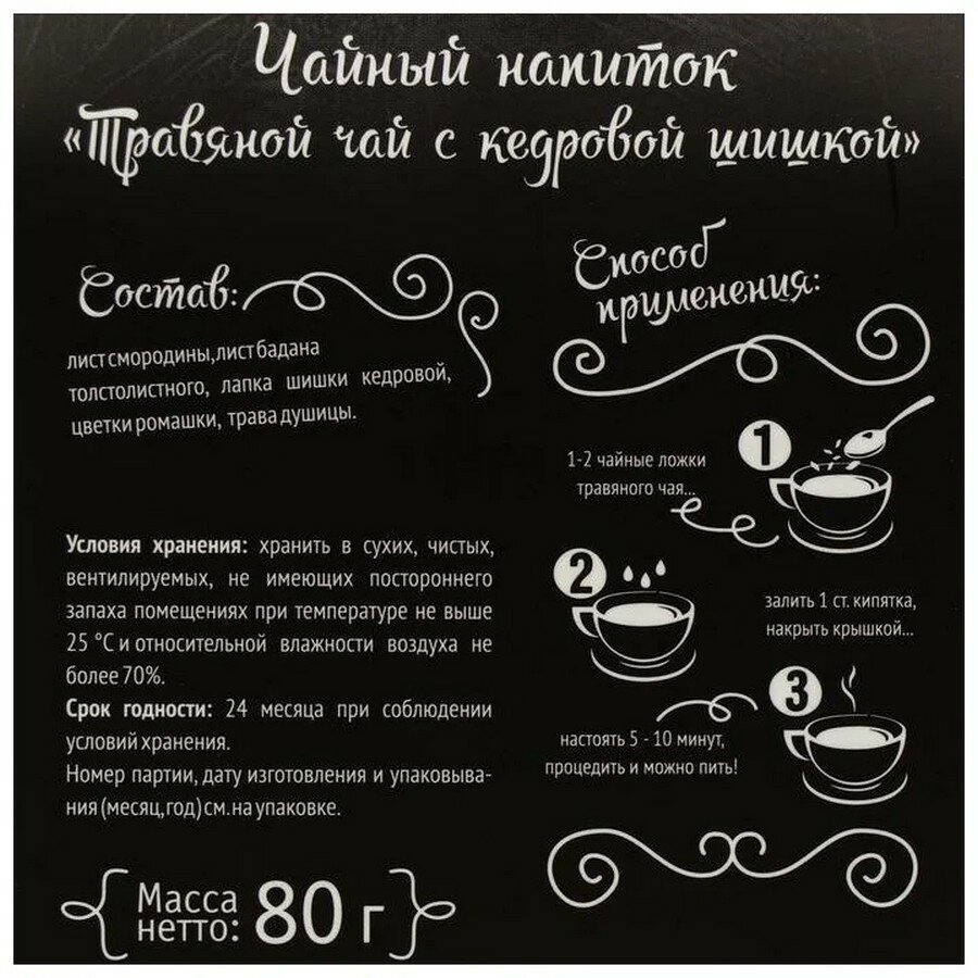 | Состав | лист смородины, лист бадана толстолистного, лапка шишки кедровой, цветки ромашки, трава душицы. |