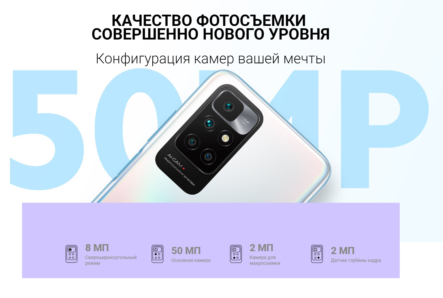 В смартфоне Xiaomi Redmi 10 установлен 6,5-дюймовый IPS-экран с разрешением 1080 х 2400 пикселей. Благодаря яркому, детализированному изображению и насыщенным и в то же время реалистичным цветам он хорошо подходит для игр и просмотра фильмов.множество возможностей для съёмкиОсновной объектив квадрокамеры может похвастаться 50-мегапиксельной матрицей, которая отлично фиксирует мельчайшие подробности. Она дополнена сверхширокоугольным модулем для панорамных фото и датчиками для макросъёмки и создания портретов с мягко размытым фоном. За селфи и видеосвязь отвечает фронталка 8 Мп, которая размещена в небольшом вырезе в верхней части дисплея.высокая производительностьМощный восьмиядерный процессор Mediatek Helio G88 позволяет не только решать повседневные задачи. Ему по силам запуск многих требовательных игр и ресурсоёмких приложений.достойная автономностьЁмкость аккумулятора составляет 5000 мАч. Он поддерживает технологию быстрой зарядки, поэтому при необходимости вы с минимальными затратами времени восстановите запас энергии.