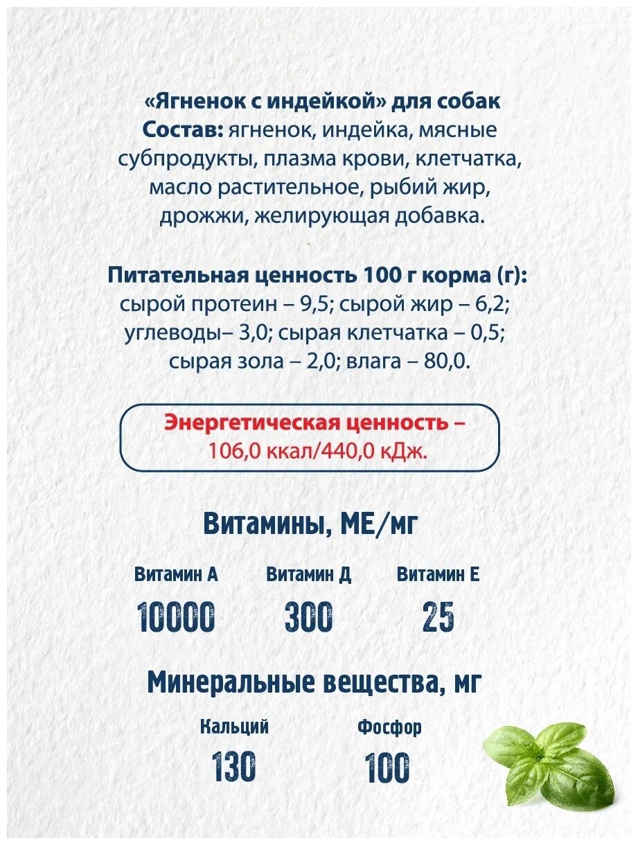 Телятина и индейка: Телятина, индейка, мясные субпродукты, плазма крови, клетчатка, масло расти-тельное, рыбий жир, дрожжи, желирующая добавка. Минеральные вещества, мг: кальций (Са), не более – 130,0; фосфор (Р), не более – 100,0; Витамины, МЕ/кг: А – 10000,0; Д – 300,0; Е – 25,0.
