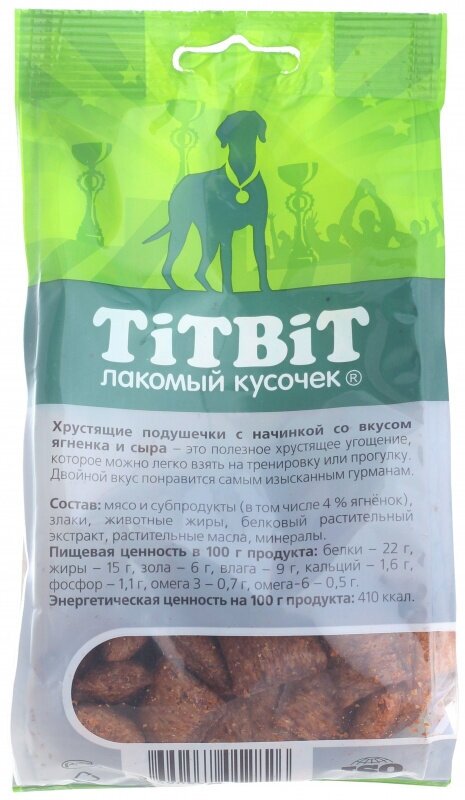 TiTBiT Продукты TiTBiT - приготовлены по особой технологии, которая позволяет сохранить все питательные вещества и микроэлементы. Не подвергаются механической и высокотемпературной обработке, что позволяет сохранить структуру живой ткани. Сохраняют естественный вкус и запах, который так нравится домашним животным. Укрепляют десны и очищают зубы от вредного налета и зубных камней, действуя, как своеобразная зубная щетка. Хрустящие подушечки с начинкой со вкусом ягненка и сыра - это полезное хрустящее угощение, которое можно легко взять на тренировку или прогулку. ♦ Обогащено омега-3 и -6 жирными кислотами для улучшения состояния кожи и шерсти. ♦ Служит дополнительным источником протеина. ♦ Удобный размер и форма крокет для собак средних и крупных пород. ♦ Двойной вкус - ягненка и сыра - понравится даже самым изысканным гурманам. Ингредиенты: мясо и субпродукты (в том числе 4% ягненка), злаки, животные жиры, белковый растительный экстракт, растительные масла, минералы.Пищевая ценность (на 100 граммов): белки - 22 г, жиры - 15 г, клетчатка - 2,5 г, зола - 6 г, влага -9 г,кальций- 1,6 г, фосфор - 1,1 г, омега 3 - 0,7 г, омега 6 - 0,5 г. Энергетическая ценность: 410 ккал / 100 граммов.