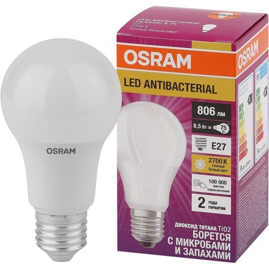 Светодиодные лампы для общего освещения, которые уничтожают бактерии и микробы благодаря фотокаталитическому покрытию колбы. Лампы OSRAM LED Antibacterial получили лабораторное подтверждение эффективности от МГЦД. Согласно ему, 2 лампы в помещении 32 куб.м за 24 часа уничтожают золотистый стафилококк на 93-97%. Лампа оснащена цоколем типа Е27, который подходит для большинства светильников.