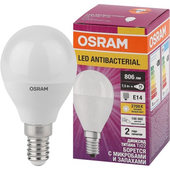 Светодиодные лампы для общего освещения, которые уничтожают бактерии и микробы благодаря фотокаталитическому покрытию колбы. Лампы OSRAM LED Antibacterial получили лабораторное подтверждение эффективности от МГЦД. Согласно ему, 2 лампы в помещении 32 куб.м за 24 часа уничтожают золотистый стафилококк на 93-97%. Лампа оснащена цоколем типа Е27, который подходит для большинства светильников.