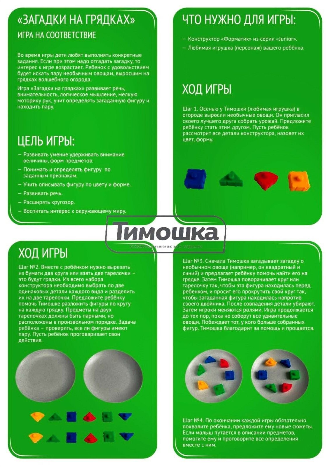 Их разнотипность расширяет представление о разнообразии форм и величине предметов, что легко увидеть в игре "Загадки на грядках" разработанной брендом "Тимошка" в помощь педагогам и родителям.