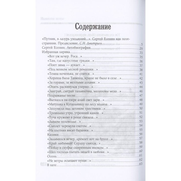 В настоящее издание включены самые значительные стихотворения автора из его поэтических книг "Радуница", "Преображение", "Голубень", "Троерядница", "Москва кабацкая", "Исповедь хулигана" и "Персидские мотивы" (1916-1925), а также 35 так называемых "маленьких поэм" Сергея Есенина, от "Марфы Посадницы" (1914) до "Мой путь" (1925), в которых воедино соединились родная история и современность, воспеть которые выпало "самому народному" русскому поэту.