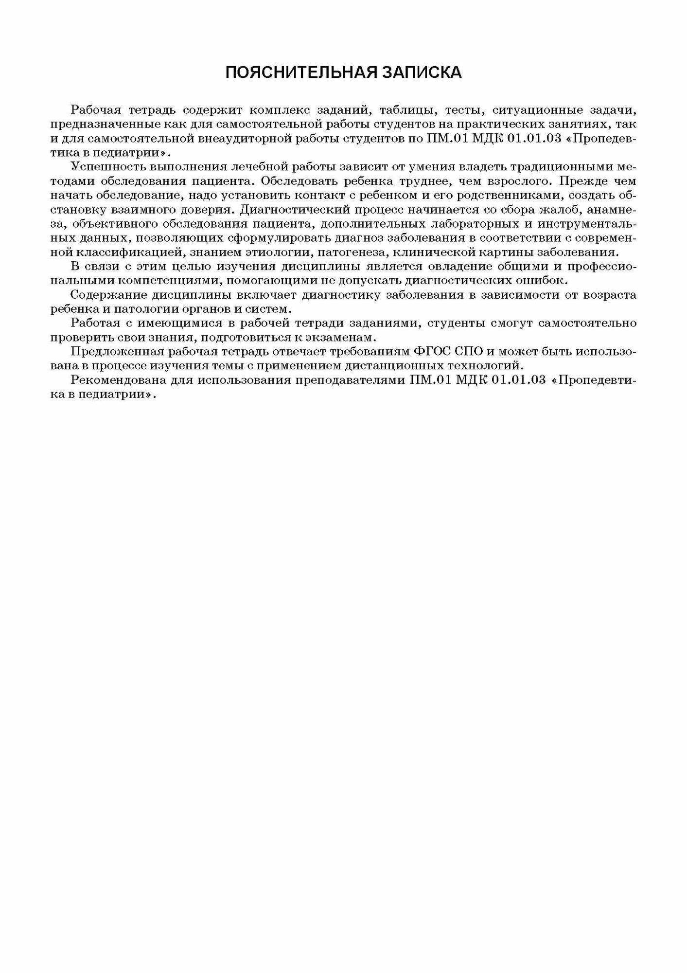 Рабочая тетрадь содержит комплекс заданий, таблицы, тесты, ситуационные задачи, предназначенные как для самостоятельной работы студентов на практических занятиях, так и для самостоятельной внеаудиторной работы студентов по ПМ.01 МДК 01.01.03 "Пропедевтика в педиатрии".