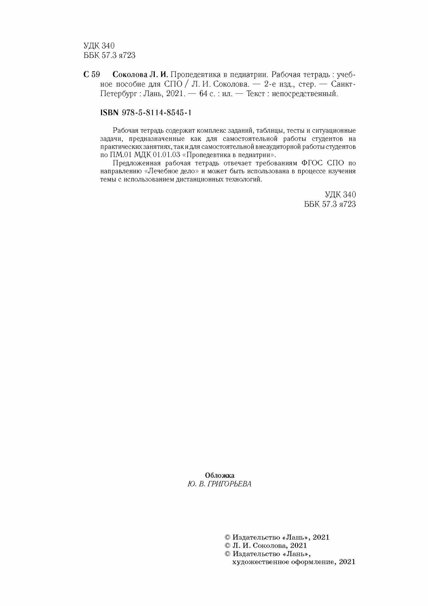Пропедевтика в педиатрии. Рабочая тетрадь. Учебное пособие для СПО (Соколова Людмила Ивановна); Лань, 2021