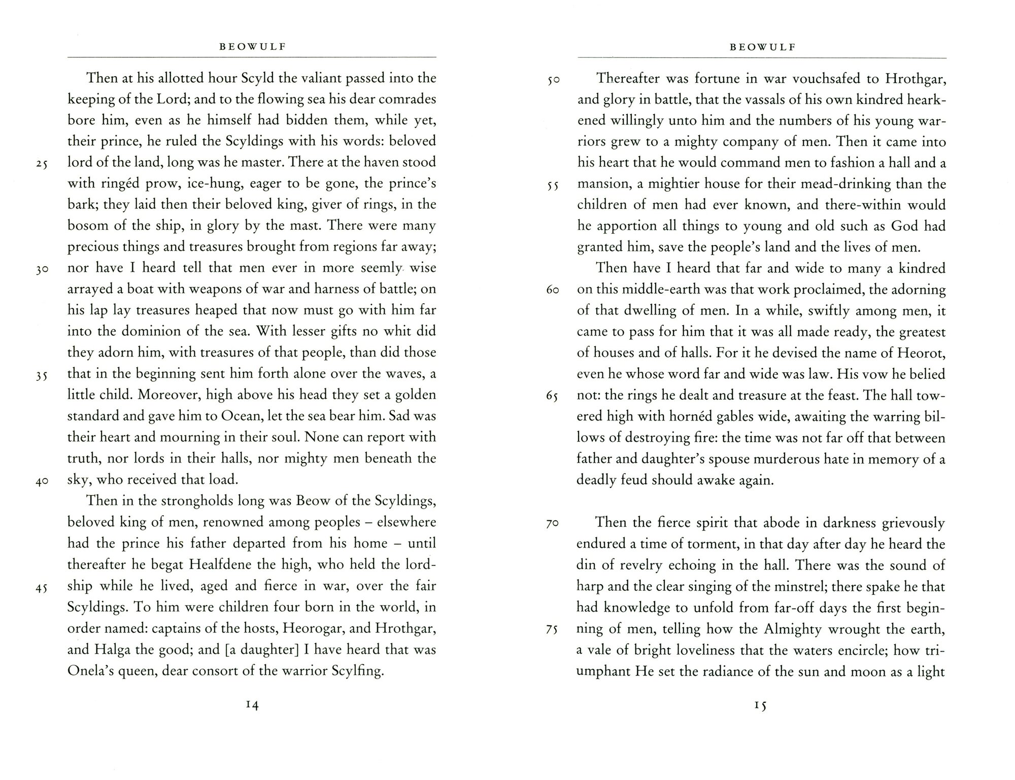 From his creative attention to detail in these lectures there arises a sense of the immediacy and clarity of his vision. It is as if he entered into the imagined past: standing beside Beowulf and his men shaking out their mail-shirts as they beached their ship on the coast of Denmark, listening to the rising anger of Beowulf at the taunting of Unferth, or looking up in amazement at Grendels terrible hand set under the roof of Heorot.