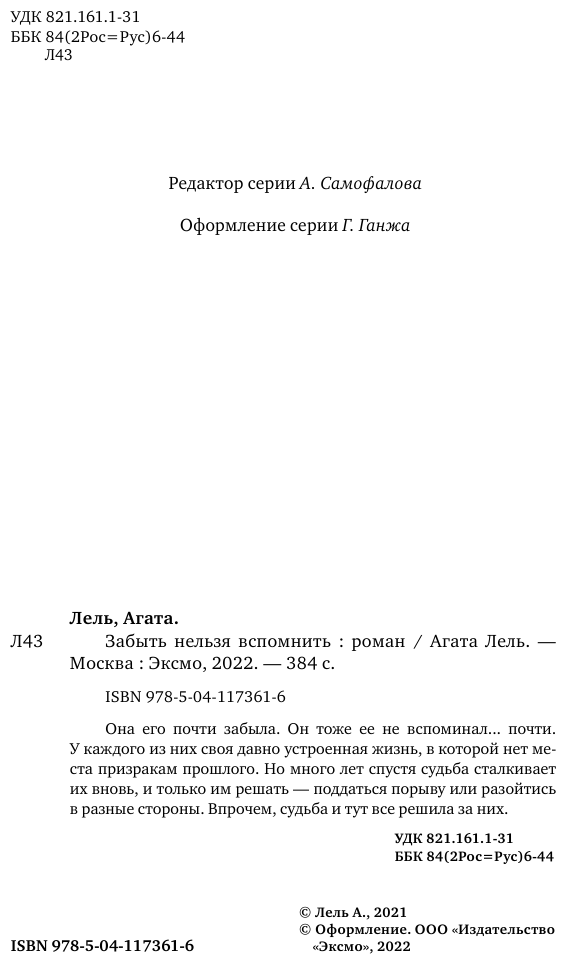 Книга: Забыть нельзя вспомнить (Лель Агата); Эксмо, Редакция 1, 2021